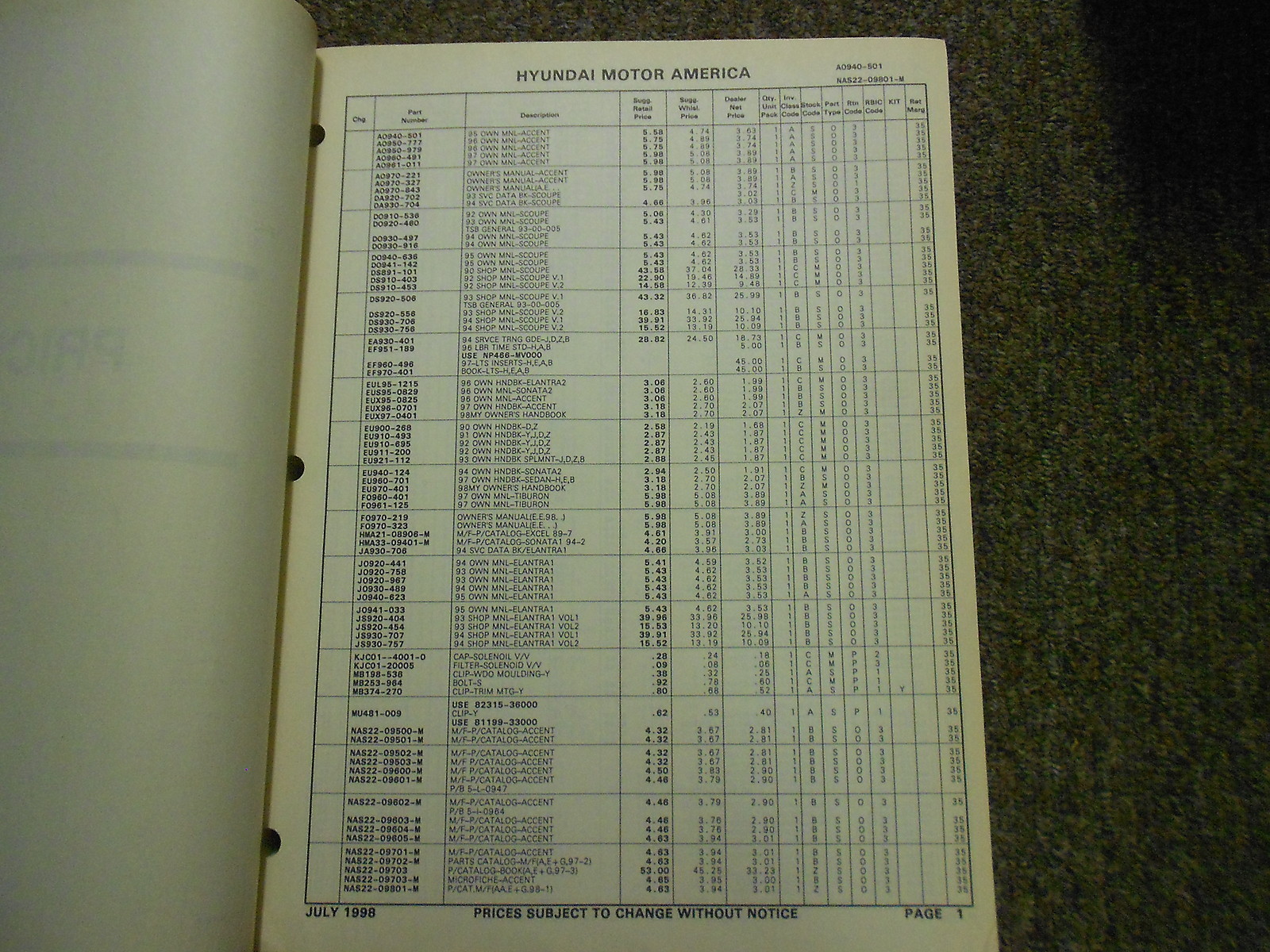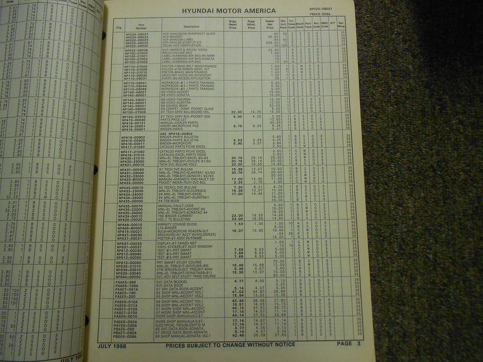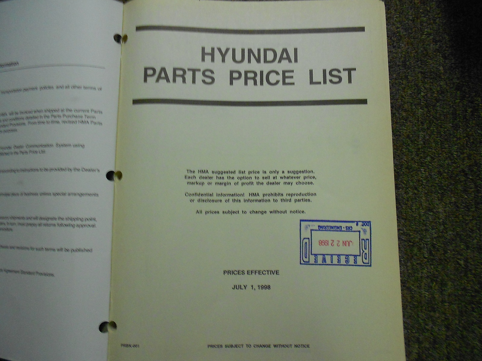 1998 HYUNDAI PARTS PRICE LIST MANUAL