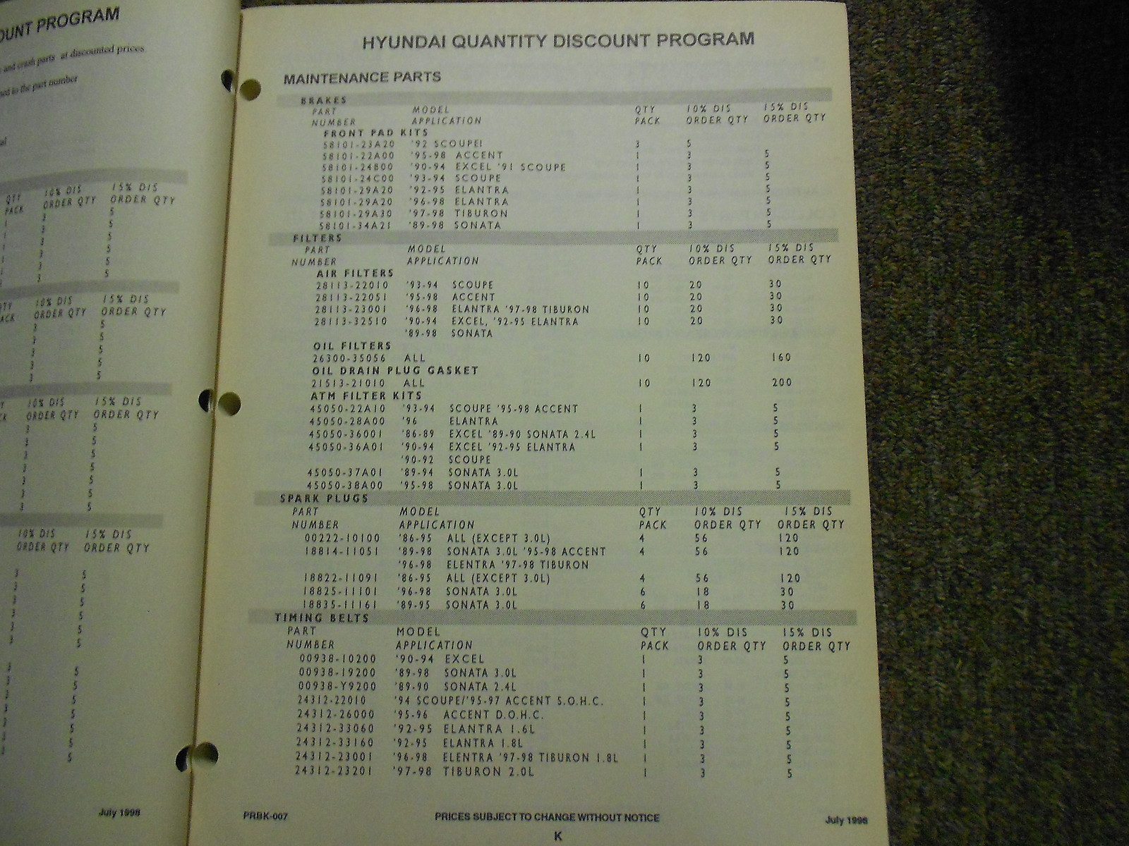 1998 HYUNDAI Parts Price List Manual JULY Tiburon Elantra FACTORY OEM BOOK 98