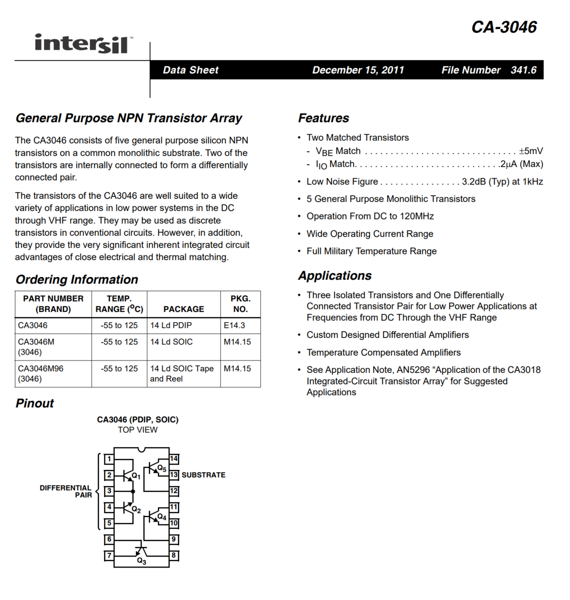 1 Piece - CA3046 Intersil 5 NPN Transistor Array DC to 120MHz DIP-14