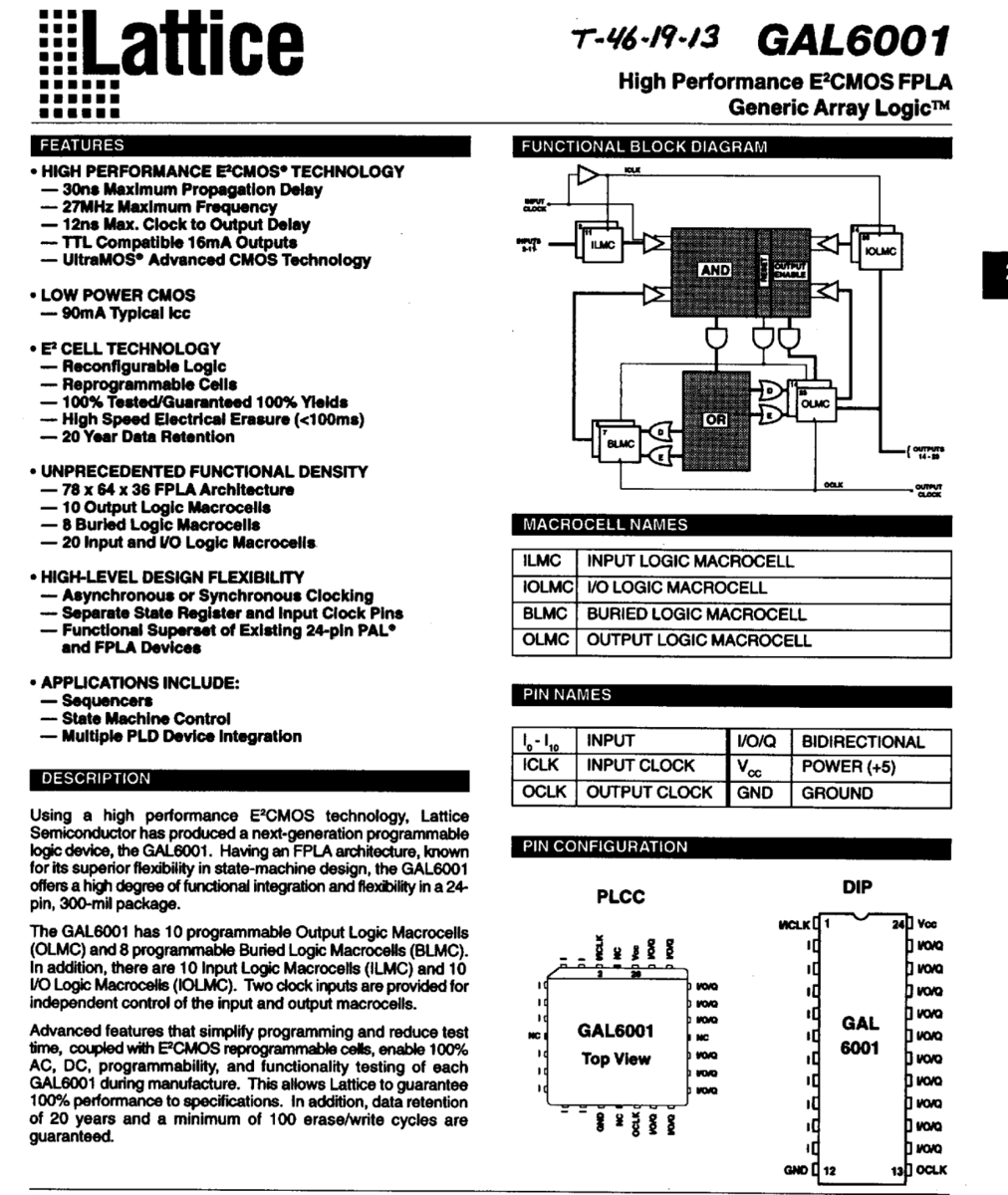 Primary image for 1X GAL6001-30P LATTICE E2CMOS FPLA Generic Array Logic 30ns DIP-24