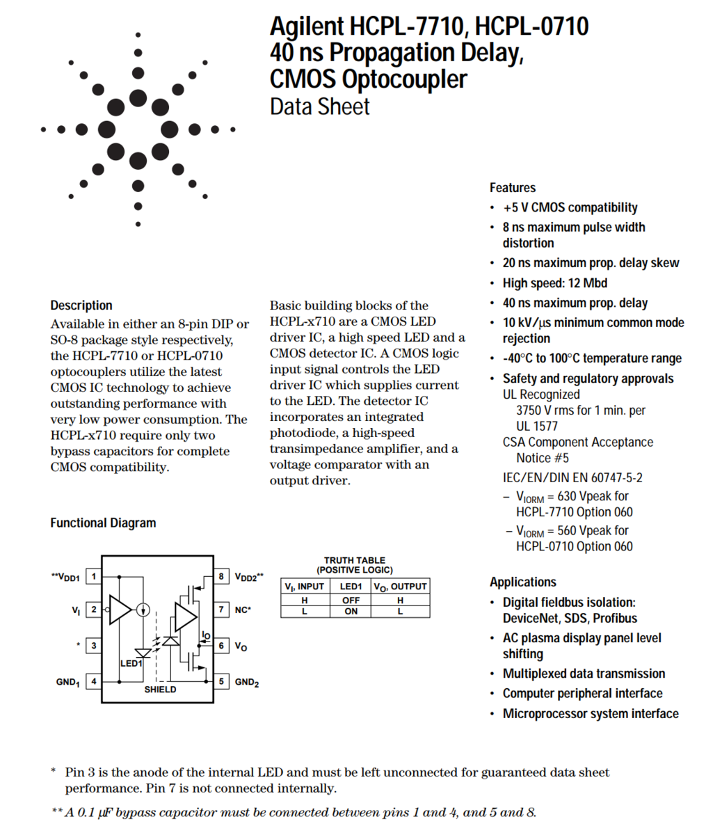 1 Piece - HCPL-7710 Agilent High Speed CMOS Optocoupler 12Mb/s 3750Vrms Isolation DIP-8