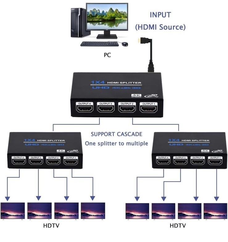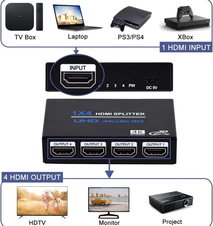 1x4 HDMI Splitter, 1 in 4 Out HDMI Splitter Audio Video Distributor Box Suppo...