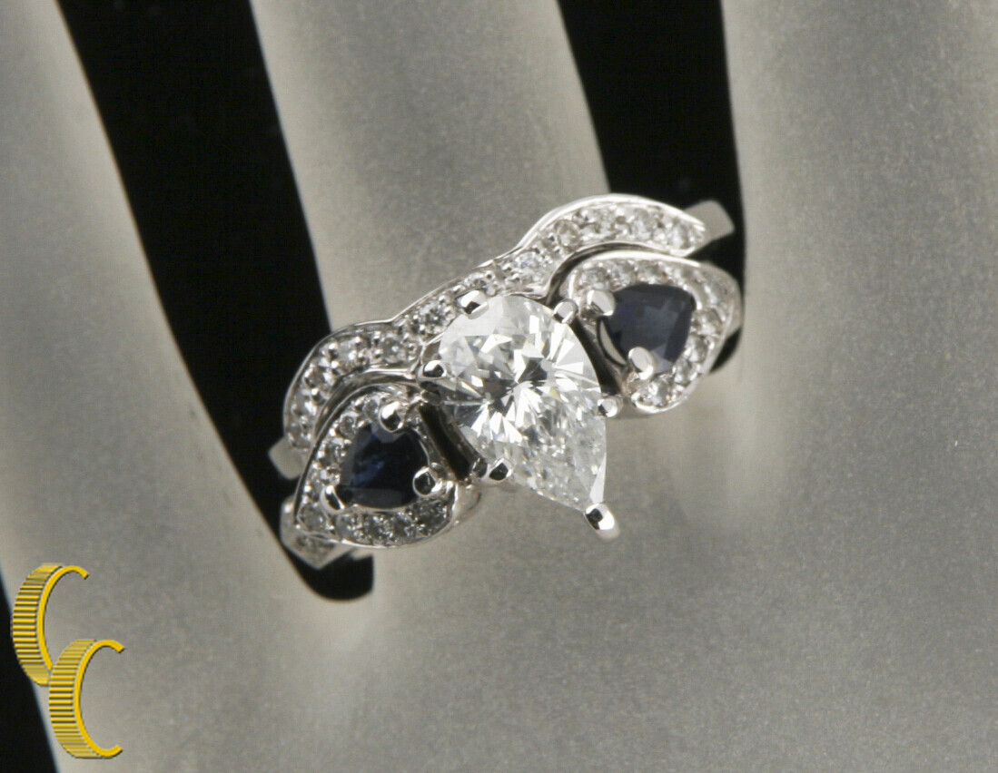 Ein mit Birnen facettierter Saphir ist auf beiden Seiten des Mitteldiamanten montiert.