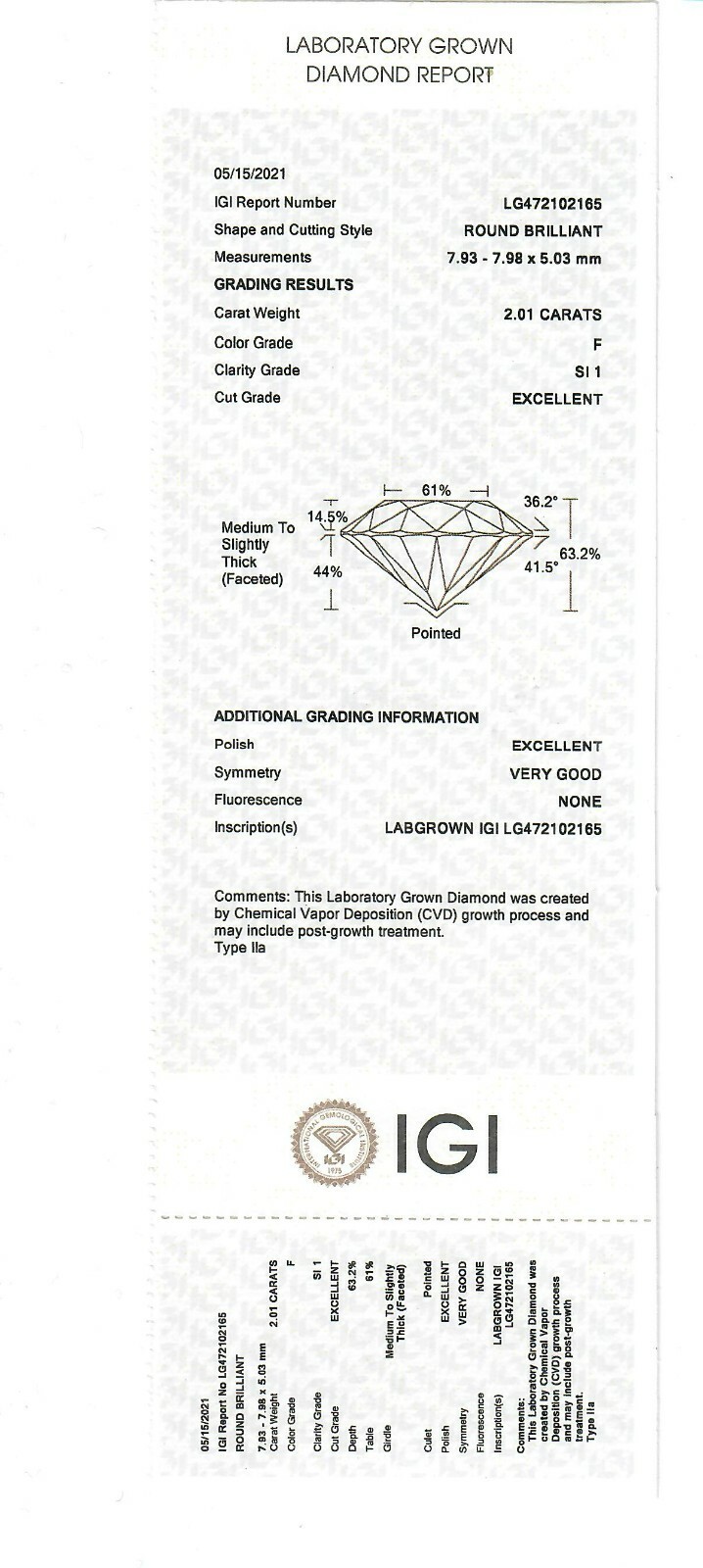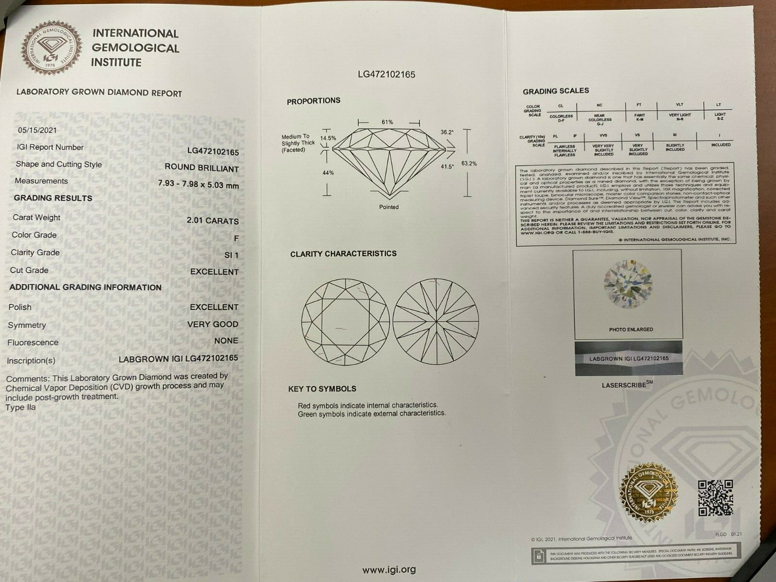- 2.01 CT CVD Labo Grown Round Diamond F SI1 Igi Certified- show original title...