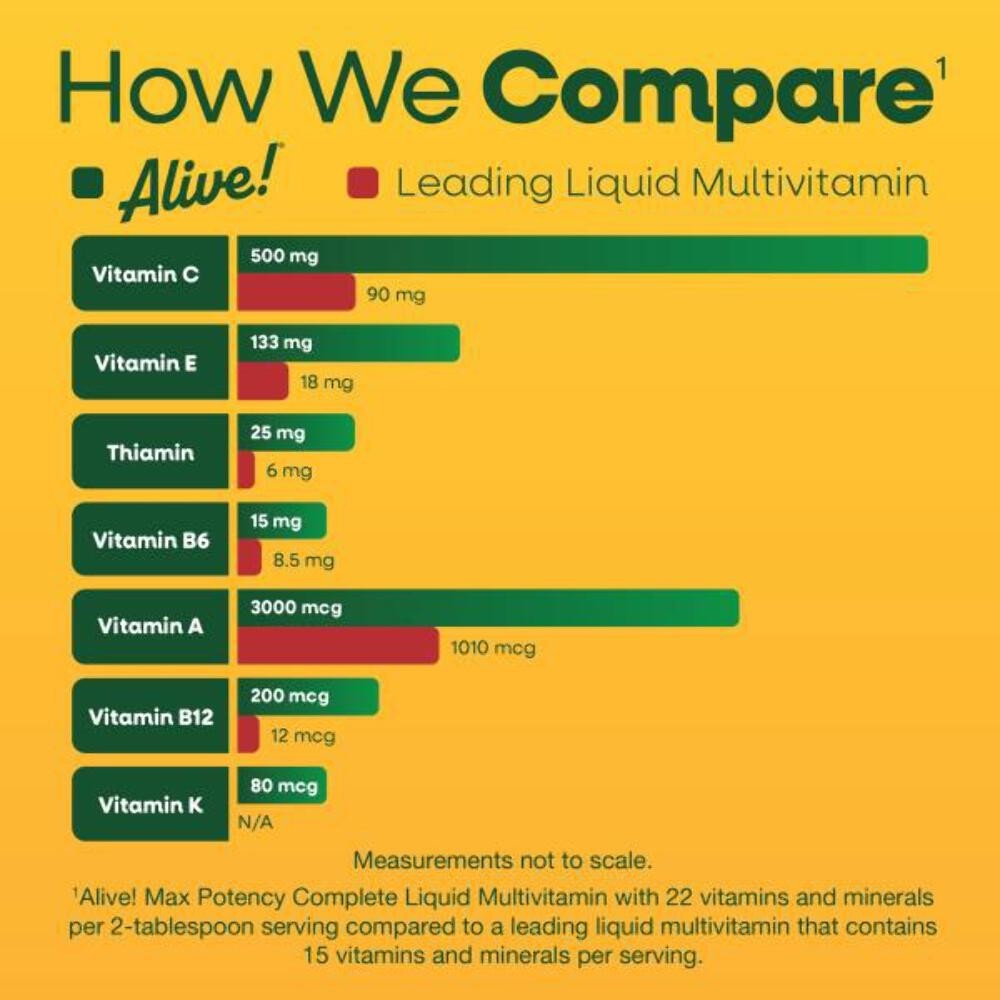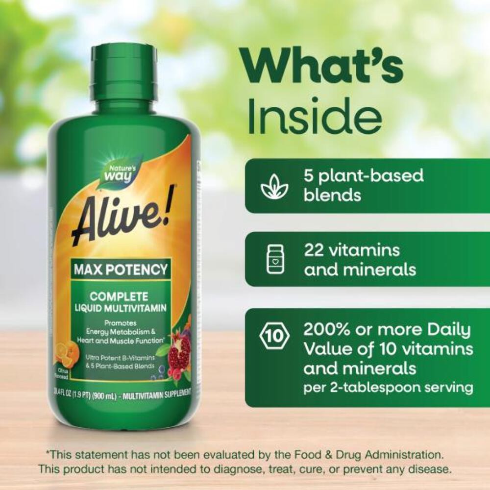 Expiration Date of 02/2026 ? Nature's Way Alive! Max Potency Complete Liquid Multivitamin promotes daily wellness, including energy metabolism, heart health and muscle function* ? Formulated with 22 vitamins and minerals, including 200% or more Daily Value of 10 vitamins and minerals per 2 Tablespoon serving. With B-vitamins, vitamins A, C, D, and E, biotin, and zinc in a liquid multivitamin for men and women ? Made with 5 plant-based blends including a Daily Greens Blend with Spirulina, Chlorella and Barley, a Mushroom Defense Blend, and Citrus Bioflavonoid Complex ? As a dietary supplement, adults take 1 capful or 2 tablespoons once daily of liquid vitamins for women or men. Best with food or immediately after a meal. Can be consumed alone or added to water, juice, or smoothies ? Dairy-free, Alive women's and men's multivitamin