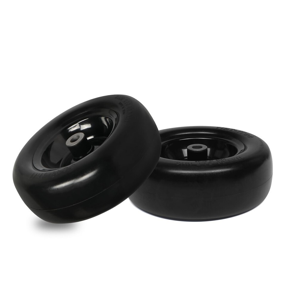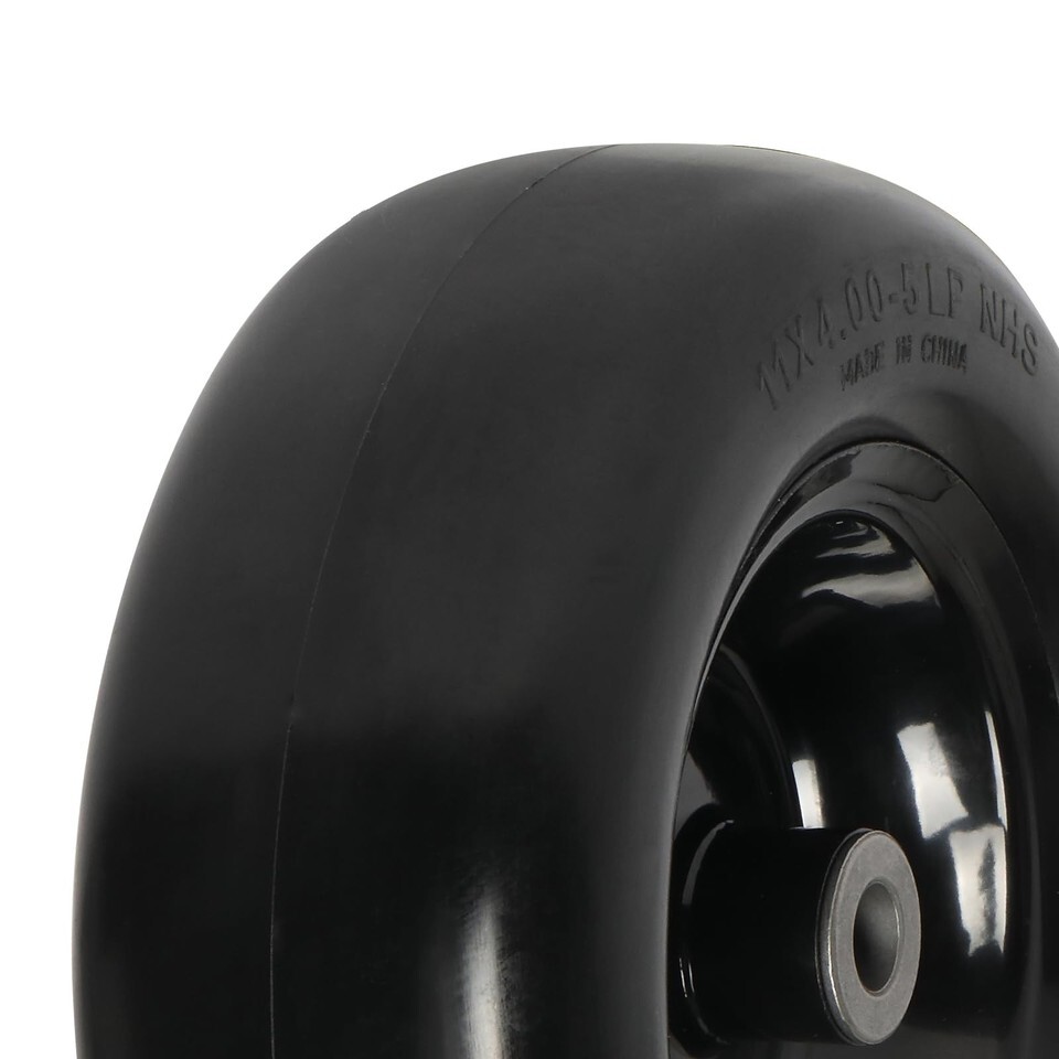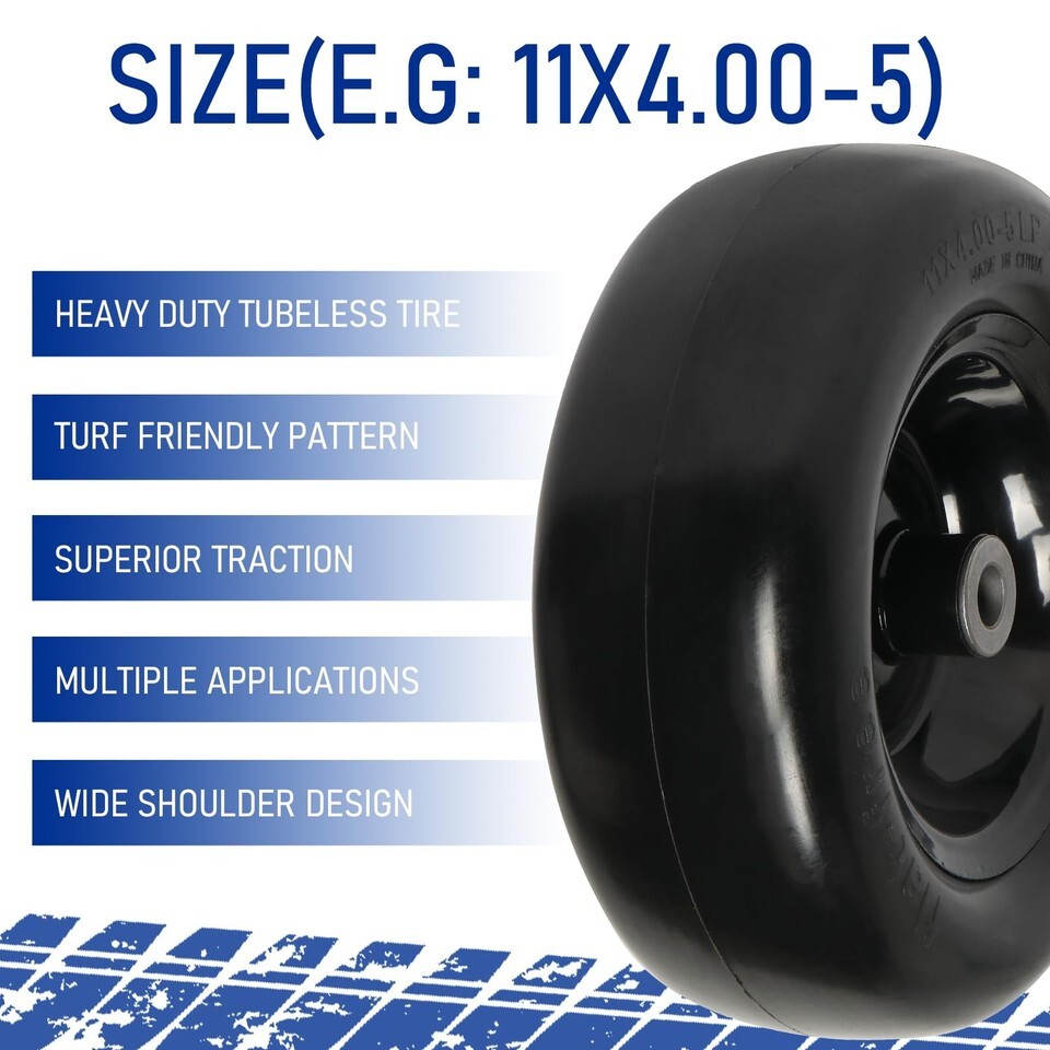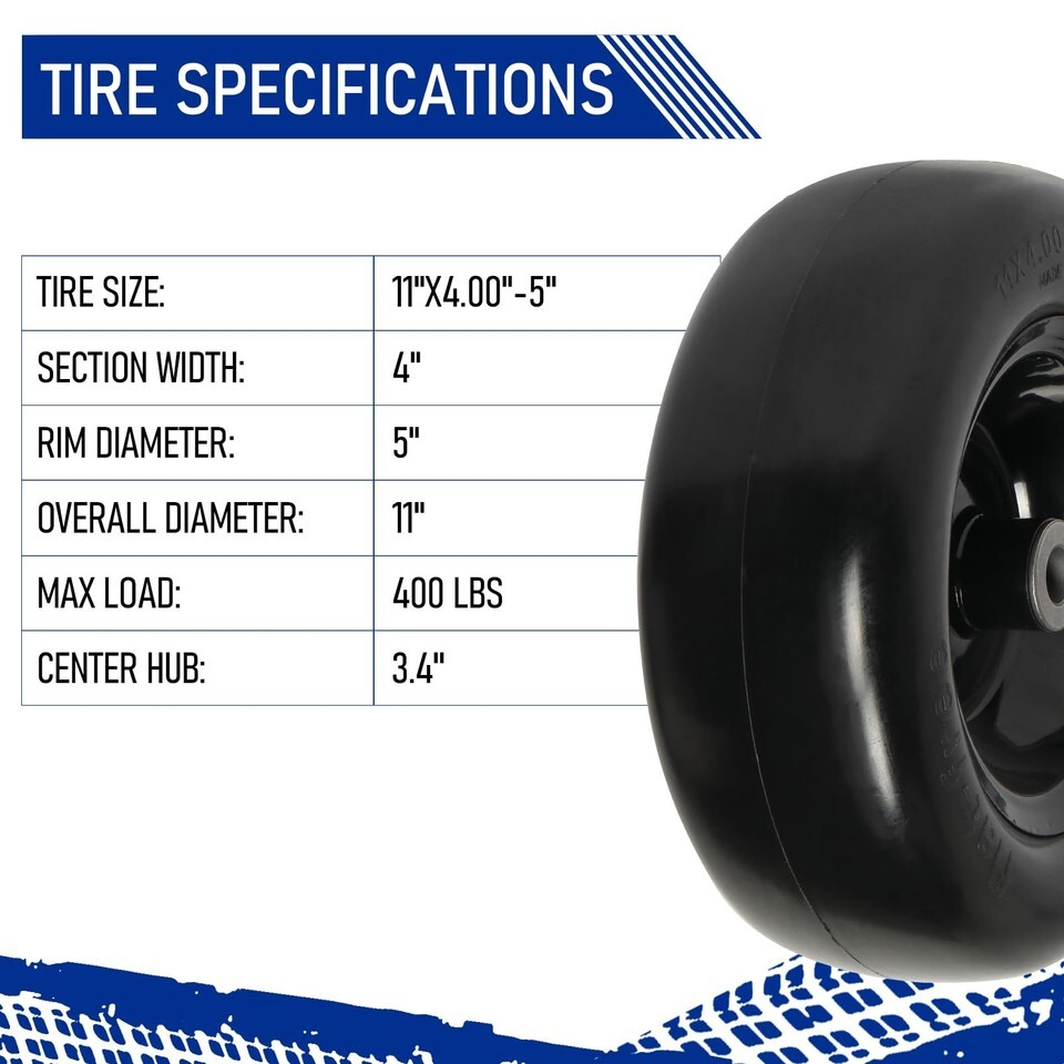 2 Flat Free Tires 11x4.00-5 Lawnmower Husqvarna Z24 Z246 RZ4623 Kubota Z123 Install these flat-free tires on your mower and enjoy a smoother, worry-free ride! 11x4.00-5 Flat-Free Tire Set (2 Pack): Heavy-duty solid tires designed for zero-turn mowers and outdoor equipment. Perfect replacement for worn or punctured front mower tires. Universal Fit with Adjustable Hub: Centered hub fits 3.4", 4", 4.5", and 5" lengths and includes both 3/4" and 5/8" bore options. Easily adjustable with included bearing spacers and sleeves for multiple mower models. Solid Polyurethane ? No More Flats: Built from premium solid polyurethane and reinforced with alloy steel rims, these flat-free tires deliver long-lasting durability, smooth rolling, and complete puncture resistance. High Load Capacity Long Wear Life: Each tire supports up to 400 lbs and provides exceptional traction and stability on grass, dirt, and uneven terrain?ideal for heavy-duty lawn maintenance. Complete Hardware Kit Included: Comes ready to install with all bearings, spacers, and adapter sleeves (3/4", 5/8", and 1/2"), making setup fast and hassle-free. Smooth Tread for Lawn Safety: The non-marking smooth tread offers excellent maneuverability while protecting your grass from tearing or damage. Multi-Purpose Application: Suitable for zero-turn mowers, garden carts, wheelbarrows, and landscaping equipment?a reliable, all-around outdoor tire solution. DOT Certified ? Not for Highway Use: DOT compliance number R3. Maximum speed under 80 km/h. Please verify your current tire and rim size before purchase. Shipping Return Policy We proudly offer FREE shipping on all orders within the lower 48 U.S. states. Please note that we do not offer combined shipping, local pickup, or delivery to P.O. boxes or APO/FPO addresses. Customer satisfaction is very important to us, and we want you to have a great experience. If there are any issues with your order, please contact us directly before opening a case or requesting a return. This allows us to resolve the matter quickly and provide you with a return authorization if needed. We proudly offer 30-Day Free Returns for your convenience.