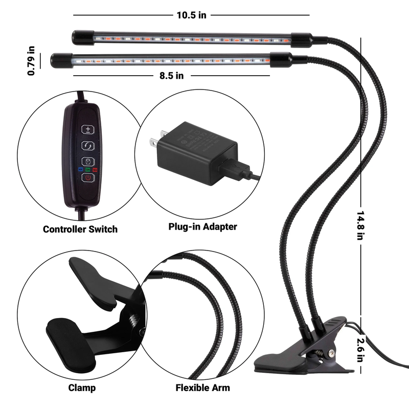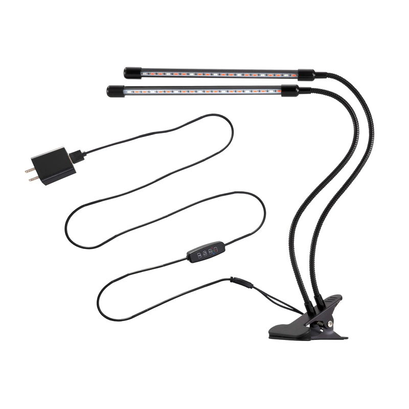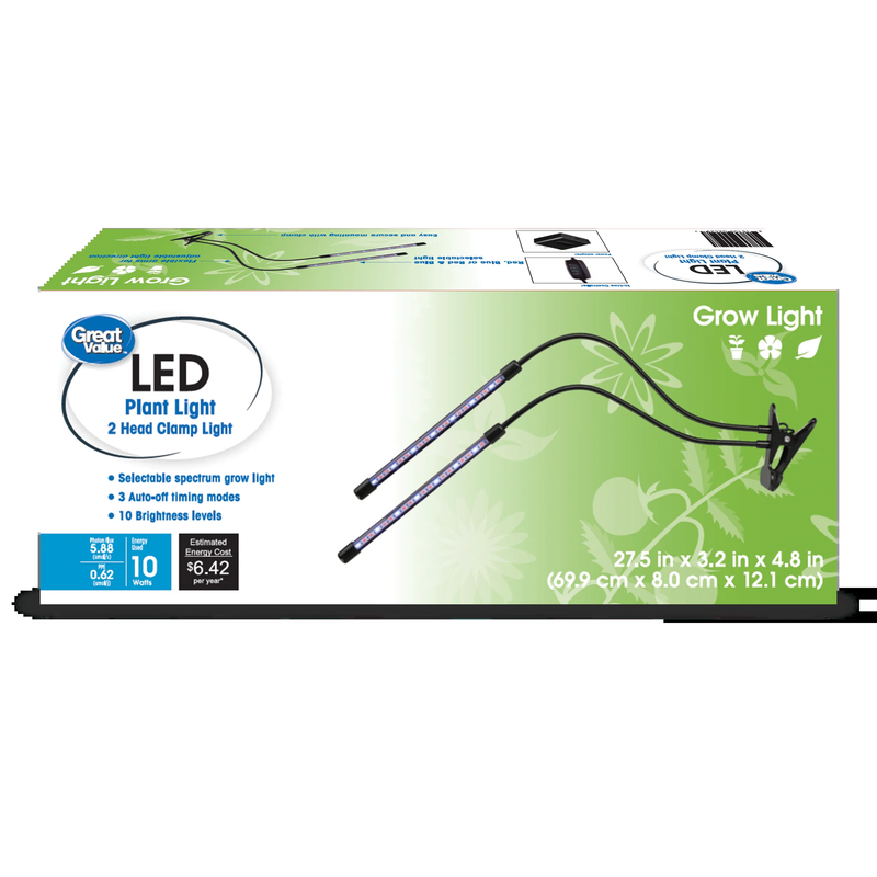 The Great Value 2-Head LED Clamp Grow Light features flexible black arms to allow light placement versatility based on each grower's needs. The 10.5-inch aluminum LED Grow Light heads can be independently positioned over multiple plant locations by bending individual flexible steel arms. Whether you're an experienced grower or a first-timer, this light is easy to use and brings indoor plants to life. The in-line controller operates 10 Level Brightness (10% - 100%), 3 Lighting Modes (Red only, Blue only, or Red + Blue), 3 Auto-Off Time Modes (4 Hour, 12 Hour or 16 Hour), On/Off with Memory*. The 2-Head LED Clamp Grow Light features 10 10-watt selectable spectrum and flexible arms that adapt to your indoor applications and help promote plant growth all year long. A 2-inch clamp at the base includes pads to help increase grip without marking surfaces. The light also features a 5-foot power cord with a USB power adapter, making it easy to use with any 120v outlet.