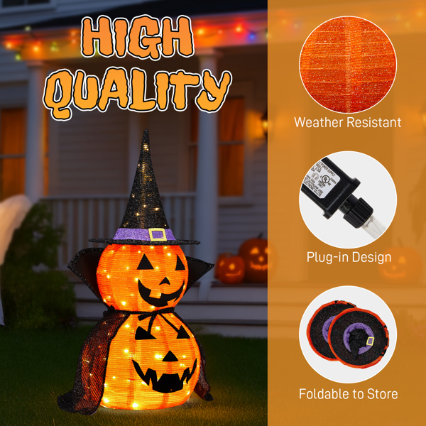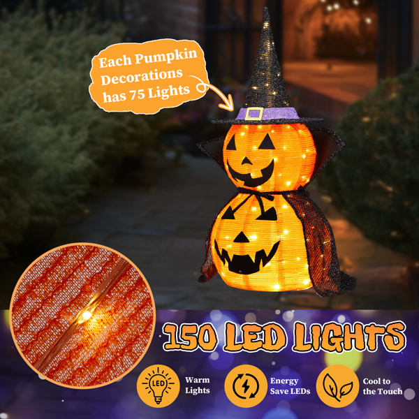 Brighten up your Halloween festivities with this 2-pack of 3ft collapsible lighted jack-o-lantern decorations. Each pumpkin features 176 warm LED lights pre-installed inside for a glowing, eye-catching effect that turns any space into a festive focal point. Made with a sturdy metal frame and thickened fabric, these decorations stand securely indoors or outdoors and are designed for long-term seasonal use. Easy to assemble, fold, and store, the pumpkins come with whimsical wizard hats and DIY-ready capes, allowing you to add your own personal spooky flair.