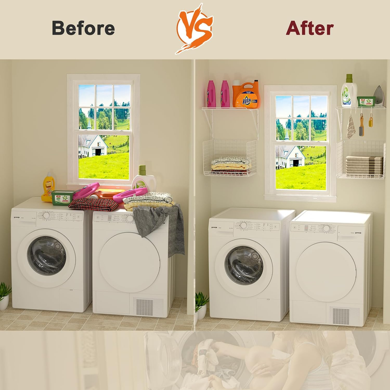 ?Convenient Space-Saving?: The laundry room wall shelves with clothes drying rack will makes your daily storage convenient, hanging clothes directly while removing from dryers or sort them, you can put laundry supplies in or on wire shelf or basket, can help you a saver space laundry organization and storage.