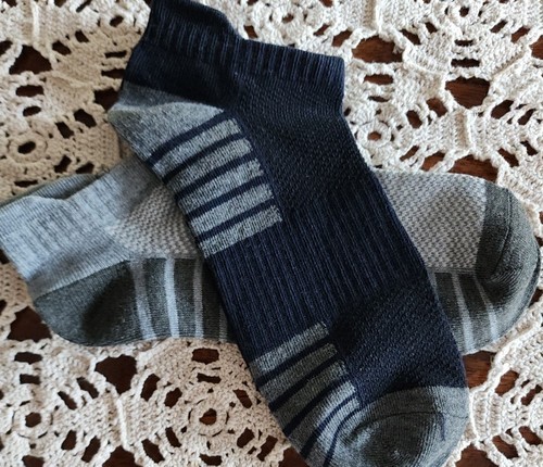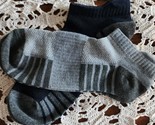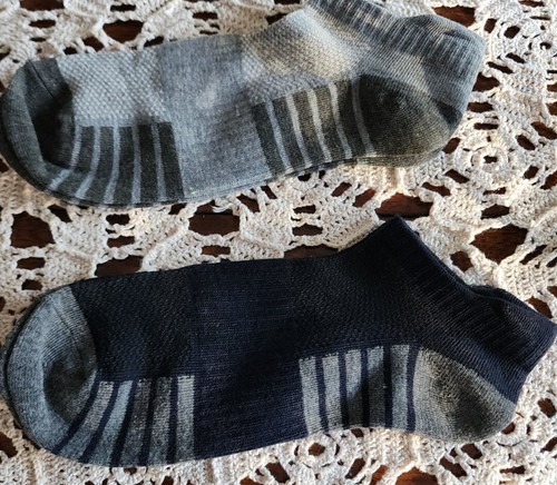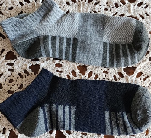 This Sale is for Two (2) Pair of Ankle Socks 1- Navy Blue 1- Gray Blocked Pattern ~ Solid ~ Stripes ~ Ribbed Tight knit Cotton ~ Polyester Blend One Size Fits Most Toe to heel (unstretched) measures approximately 8" ~ total sock length (unstretched) measures approximately 9.75" Machine wash ~ Tumble dry Socks are new ~ never worn Please view photos for a good description of this item Thank you!
