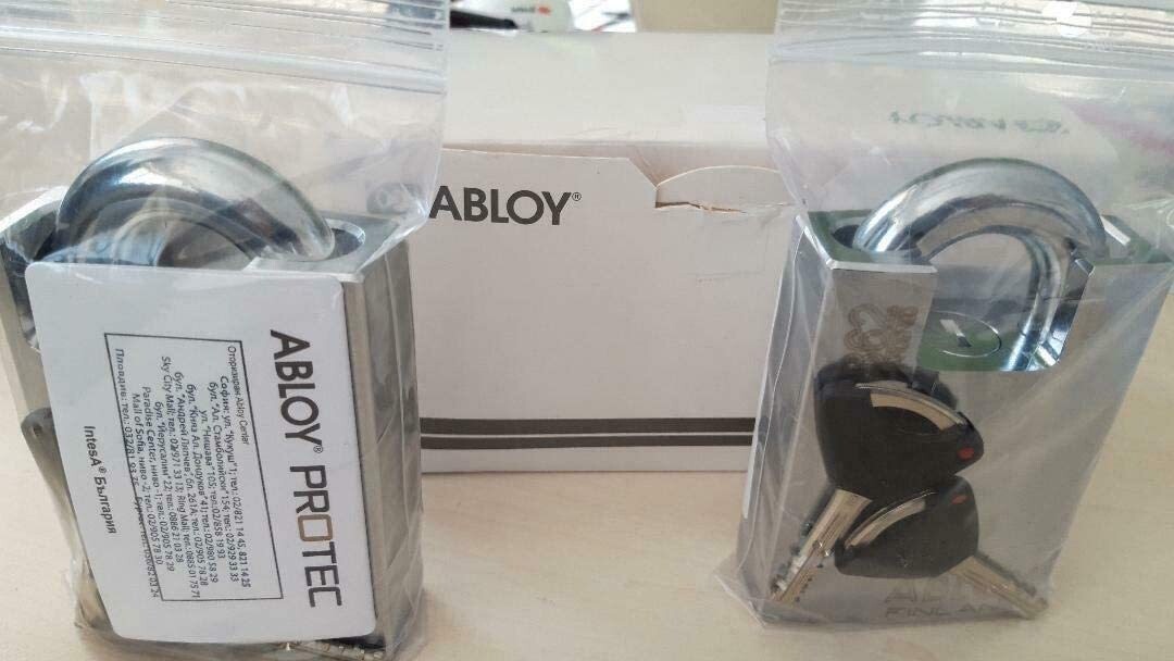 2 keyed alike padlocks Abloy PL362N key system Protec with 4 keys and ID card Case-hardened steel body with raised shoulders and a top-loaded cylinder provide the highest level of security and protection.PL362 is equipped with a case hardened boron steel shackle, diameter 15 mm. Applications include containers, train wagons, trucks, lorries, heavy sliding doors, military applications etc.