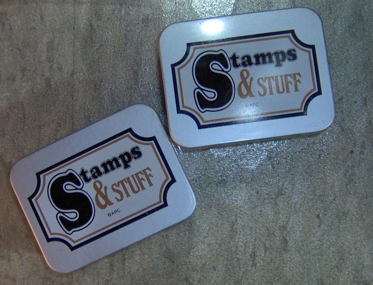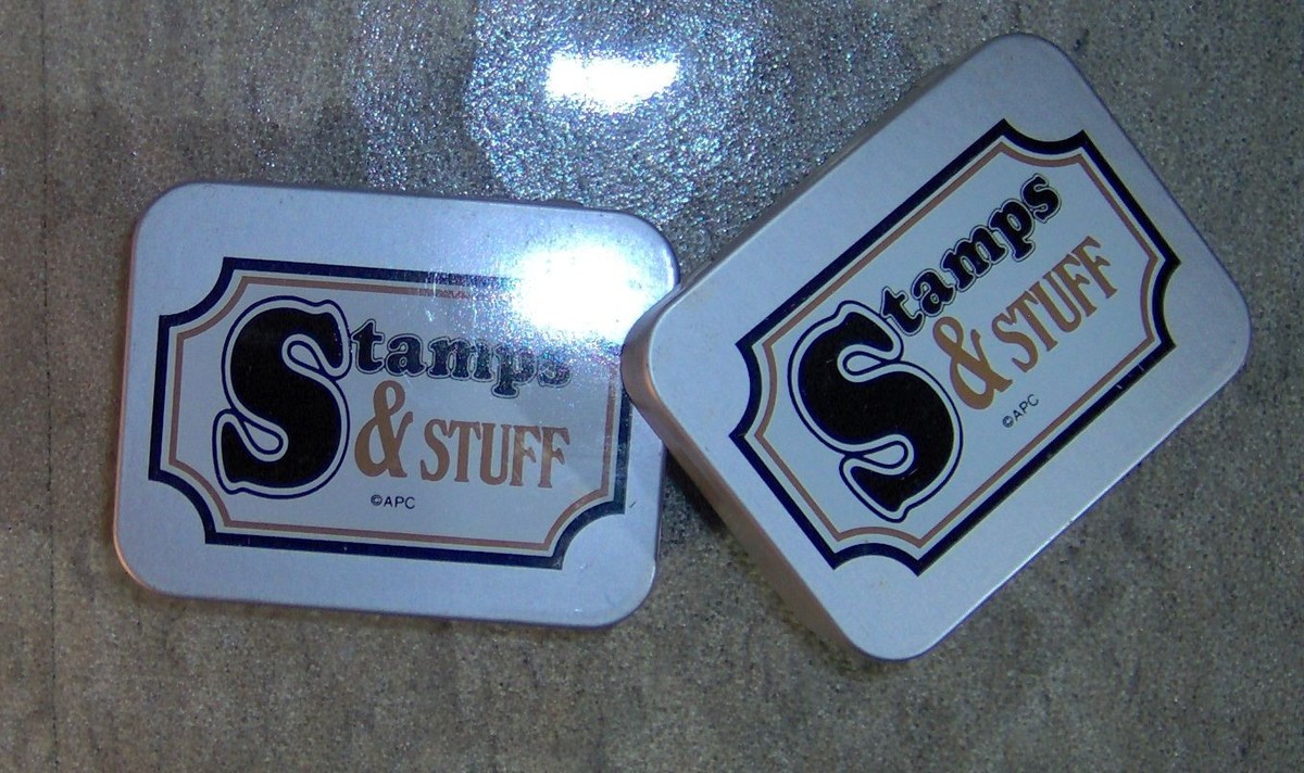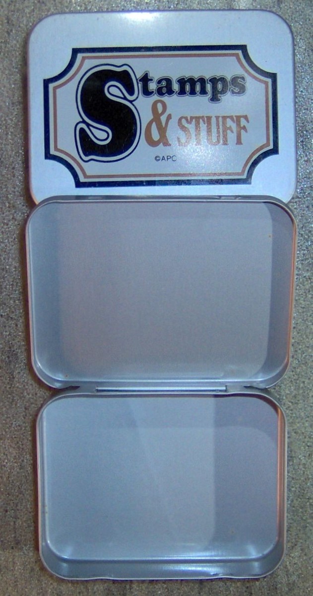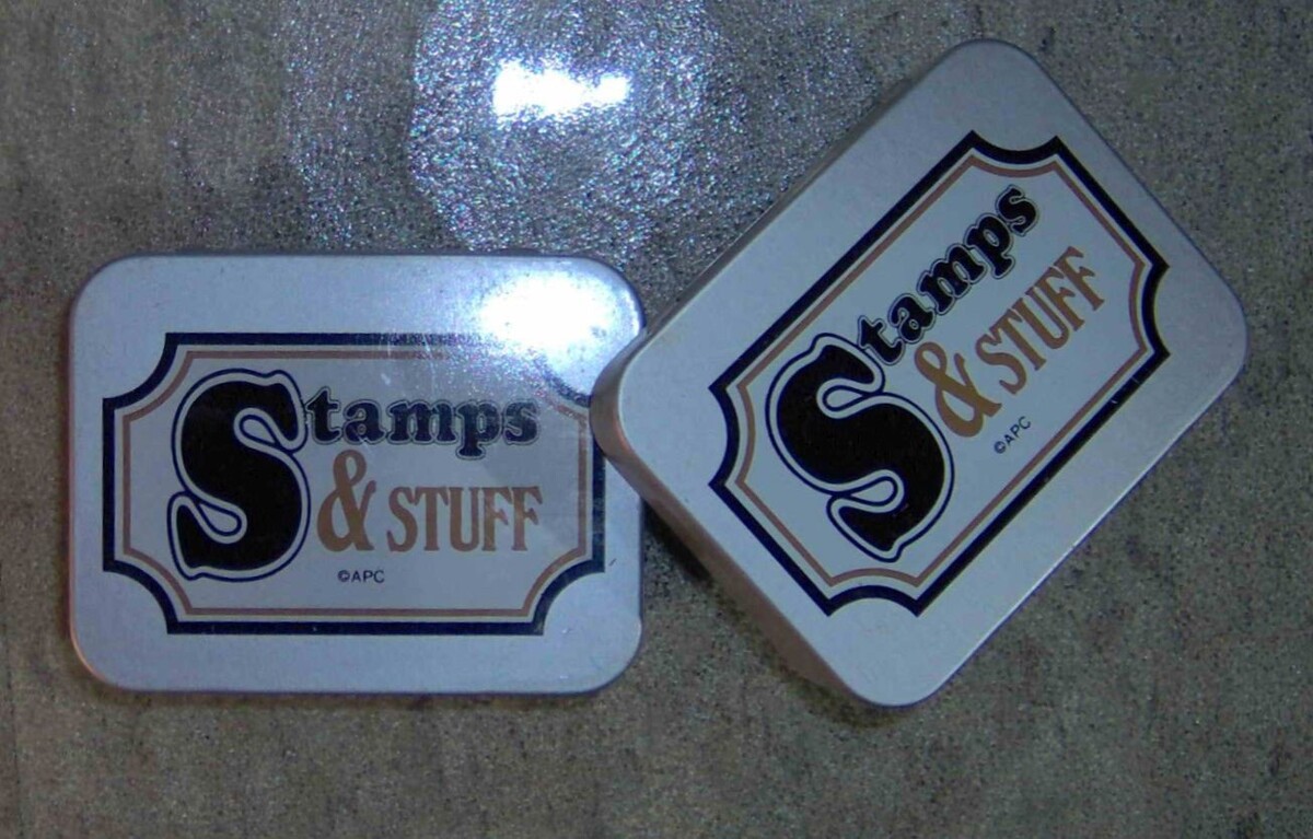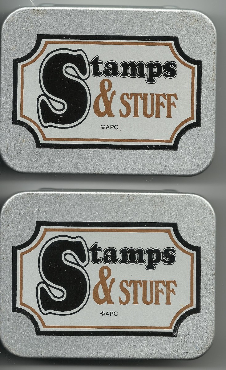 FOR SALE ARE TWO (2) VINTAGE METAL TINS ENTITLED Stamps STUFF MANUFACTURED BY AMERICAN PACKAGING COMPANY. TWO (2) IDENTICAL METAL TINS ARE 40+ YEARS OLD, Good+ CONDITION WITH SOME MINOR SCUFFS AND SIGNS OF AGE, THESE ARE THE SAME SIZE AS TRADITIONAL SUCRETS METAL TINS (3.25" x 2.5" x1" deep). THESE TWO METAL TINS WERE PURCHASED IN A STATIONARY SHOP YEARS AGO, PLACED IN THE DESK DRAWER AND NEVER USED, AS A HINGE INVESTIGATION WILL REVEAL. THE EXTERIOR TOP IS STENCILED IN DURABLE PAINT (no sticker), AND THE INTERIORS ARE IN GOOD+ CONDITION. MAKES FOR A GREAT STORAGE CONTAINER FOR STAMPS, PAPERCLIPS, PUSH PINS, ETC. YOU WILL RECEIVE TWO (2) VINTAGE USED Stamps STUFF METAL TINS, AS PICTURED, SHIPPED BY USPS.... INTENDED FOR STORAGE OF STAMPS, PAPER CLIPS, PUSH PINS, PILLS, CONDOMS, BUSINESS CARDS, SHOELACES, CONDOMS, SMALL WALLET SIZE PICTURES OF YOUR CHILD, RUBBER BANDS, BUTTONS, SMALL JEWELRY, LIP BALM LIKE CHAPSTICK, COINS, VITAMINS, SMALL SEWING SUPPLIES, MINTS OR CANDY, FISHING HOOKS OR LURES, WOOD MATCHES, BAND AIDS, SEEDS OR HERBS, NAILS, SCREWS, OR TACKS, DICE, TOOTHPICKS, COTTON SWABS, COUGH DROPS, BOBBY PINS, HAIR CLIPS, OLD PRICE TAGS, GLASS TILES, ETC... BID AND BUY HERE IN IN ABSOLUTE CONFIDENCE SINCE I HAVE THOUSANDS OF POSITIVE FEEDBACK AND TEN+ YEARS EXPERIENCE. I SHIP WITHIN TWO DAYS OF RECEIPT OF PAYMENT, OFTEN THE NEXT DAY. $4.81 USPS GREEN SHIPPING USING RECYCLED PACKAGING MATERIALS AND ENVIRONMENTALLY FRIENDLY MATERIALS TO ANYWHERE USA. I DO NOT SHIP ANYWHERE ELSE. HAVE A GREAT DAY AND THANK YOU FOR STOPPING BY.....