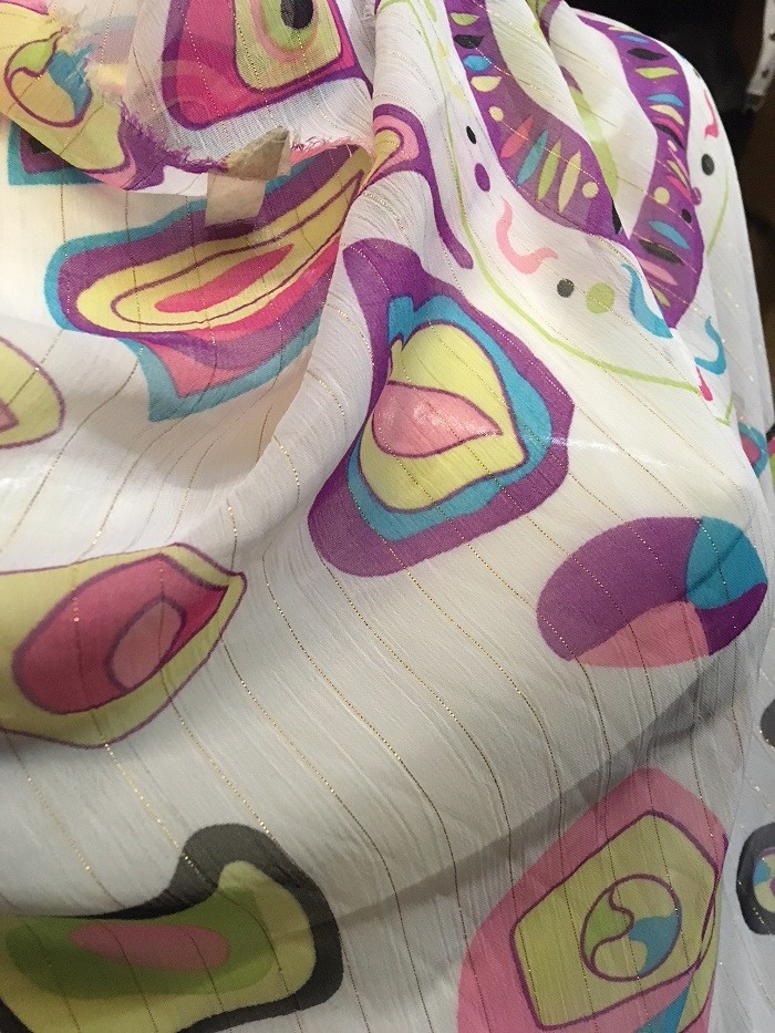This is see-through chiffon with delicate stripe gold line. It has the geometric design.