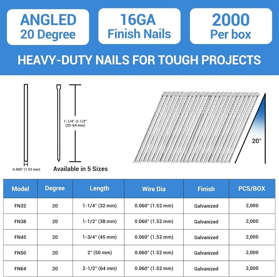 Contains 2,000 pieces of high-quality 2" galvanized 16 gauge 20-degree angled finish nails.