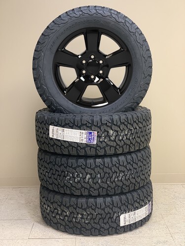 FREE SHIPPING!!! For Questions Contact DB Wheels and Tires Please Refer To Item #306639524630 *****SHOWROOM SPECIAL****** One set available. Brand new set but it's time to put something new in our showroom, so this set is yours for a major discount! New Set Of Four GM Style Replica 20" Gloss Black LTZ Five Spoke Wheels with new BFGoodrich KO2 275/55R20 tires for 2000-2026 Chevy Silverado, Suburban, Tahoe or Avalanche. Details: Wheels: Hollander #5652 20 x 9 6-lug, 6x139.7, 6x5.5 bolt pattern Wheel Offset: 27 Backspacing: 6.06 Blank center cap included (factory cap will interchange or your decal can be applied to blank cap) Replica of GM Option NZQ, 5 spoke The finish on this wheel is achieved through several different phases. The finishing process includes a black powder coat foundation followed by two layers of clear coat, not a one stage enamel. This is the correct way to finish a wheel. They have an absolutely beautiful finish with a superior sheen due to the additional layer of clear coat. Tires: BFGoodrich KO2 275/55R20 112S Style: All Terrain Overall Diameter: 32" Whether you're out to keep the adventure rolling or keep your work truck moving forward, the BFGoodrich All-Terrain T/A KO2 tire provides toughness on any terrain. There is no land you cannot conquer with the aggressive traction and maneuverability of this extremely versatile tire on mud, deep snow, gravel and rock. Engineered with Baja race?proven technology, the BFGoodrich All-Terrain T/A KO2 tire utilizes CoreGard Max Technology, which provides split- and bruise-resistant sidewall rubber, increased rubber thickness and a design that deflects protruding objects from snagging and splitting the sidewall. We didn't stop there. The BFGoodrich All-Terrain T/A KO2 tire also has an advanced footprint shape that provides robust maneuverability when you need it most, plus an even distribution of wear for long treadwear on- and off-road so you can discover more, play more and conquer more. Don?t let adverse weather stand in your way either. The BFGoodrich All-Terrain T/A KO2 tire provides all-season performance you can confidently rely on ? rain, snow or shine. It's also backed by a 50,000-Mile Warranty. 20" Gloss Black 5 Spoke LTZ Wheels BFG KO2 Tires Chevy Silverado Suburban Tahoe FREE SHIPPING!!! For Questions Contact DB Wheels and Tires Please Refer To Item #306639524630 *****SHOWROOM SPECIAL****** One set available. Brand new set but it's time to put something new in our showroom, so this set is yours for a major discount! New Set Of Four GM Style Replica 20" Gloss Black LTZ Five Spoke Wheels with new BFGoodrich KO2 275/55R20 tires for 2000-2026 Chevy Silverado, Suburban, Tahoe or Avalanche. Details: Wheels: Hollander #5652 20 x 9 6-lug, 6x139.7, 6x5.5 bolt pattern Wheel Offset: 27 Backspacing: 6.06 Blank center cap included (factory cap will interchange or your decal can be applied to blank cap) Replica of GM Option NZQ, 5 spoke The finish on this wheel is achieved through several different phases. The finishing process includes a black powder coat foundation followed by two layers of clear coat, not a one stage enamel. This is the correct way to finish a wheel. They have an absolutely beautiful finish with a superior sheen due to the additional layer of clear coat. Tires: BFGoodrich KO2 275/55R20 112S Style: All Terrain Overall Diameter: 32" Whether you're out to keep the adventure rolling or keep your work truck moving forward, the BFGoodrich All-Terrain T/A KO2 tire provides toughness on any terrain. There is no land you cannot conquer with the aggressive traction and maneuverability of this extremely versatile tire on mud, deep snow, gravel and rock. Engineered with Baja race?proven technology, the BFGoodrich All-Terrain T/A KO2 tire utilizes CoreGard Max Technology, which provides split- and bruise-resistant sidewall rubber, increased rubber thickness and a design that deflects protruding objects from snagging and splitting the sidewall. We didn't stop there. The BFGoodrich All-Terrain T/A KO2 tire also has an advanced footprint shape that provides robust maneuverability when you need it most, plus an even distribution of wear for long treadwear on- and off-road so you can discover more, play more and conquer more. Don?t let adverse weather stand in your way either. The BFGoodrich All-Terrain T/A KO2 tire provides all-season performance you can confidently rely on ? rain, snow or shine. It's also backed by a 50,000-Mile Warranty. Fits 2000-current year model Chevy Silverado 1500, Tahoe, Suburban, and Avalanche. Fits 2000-current year model GMC Sierra 1500, Sierra Denali, Yukon, Yukon Denali and Yukon XL and Cadillac Escalade. Fits 2023-current year model Chevy Colorado and GMC Canyon (does NOT fit earlier year models). Fits 2019-current year model Dodge Ram 1500 6 Lug trucks (does NOT fit earlier year models or 5 lug trucks) Dress up your truck or SUV with these new GM Style Replica Wheels and New Tires. Included in This Package Set of Four TPMS Sensors programmed and installed (please indicate your year model at checkout or send us a message otherwise sensors will be programmed for 2007-2018 GM truck or 2007-2020 GM SUV Blank Center Caps (original center caps are interchangeable or decals can be applied to blank caps) Available for Additional Purchase Set of 24 Polished GM Lug Nuts (item number 303805148468) Set of 24 Black Lug Nuts (please contact us to purchase) This purchase will be for FOUR wheels and tires. "Quantity of 1" means a set of 4 wheels with mounted tires. These are mounted and balanced and ready to put on your vehicle. Wheels include a lifetime warranty on structure and a one year warranty on the finish. If you do not respond to our messages requesting year, make and model, then these will ship with TPMS for 2007-2018 GM 1500 trucks or 2007-2020 GM 1500 SUVs. If your vehicle model is outside this range and you did not message us before they are shipped, then you will be responsible for purchasing the c
