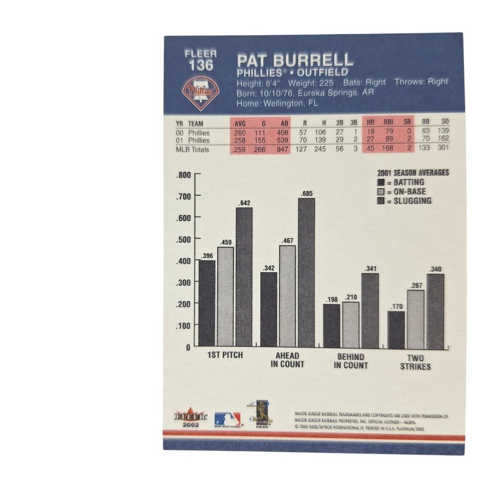 2002 Fleer Platinum Pat Burrell #136 Philadelphia Phillies MLB Baseball Card Excellent pre owned condition, all cards come in protective sleeve. SC280,SC281,SC282