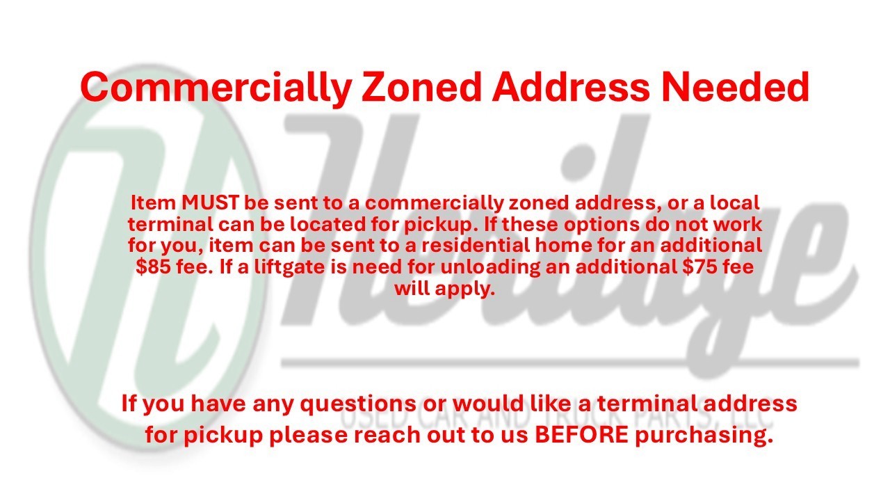 We will not ship freight items and some larger or fragile parts outside of the 48 US states. For large items that must be shipped via Freight Truck (i.e. engines, transmissions, doors, trunks, hoods...etc), the delivery site must be a commercially zoned address capable of unloading a freight truck. There will be an extra charge if you ask for liftgate service.