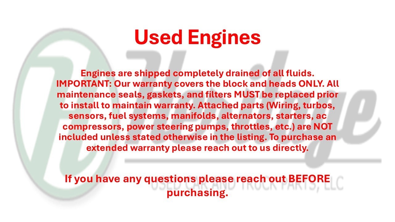 Some vehicles have different specs that must be matched to ensure fit. If you have any questions about if this part will fit your vehicle, please call or text 251-375-2135 Engines are warranted as a long block only. A long block consists of a block and head(s). Attached parts (Wiring, turbos, sensors, fuel systems, manifolds, alternators, starters, ac compressors, power steering pumps, throttles, etc.) are NOT included unless stated otherwise in the listing. If any of the attaching parts are left on the engine, they are not covered by warranty. These engines are sold with the understanding that wiring, sensors, fuel systems, manifolds, etc. may need to be changed to fit your application (these items may or may not be on the engine.) All maintenance seals, gaskets, and filters MUST be replaced prior to install to maintain warranty. Engines are shipped completely drained of all fluids. IMPORTANT: Our warranty covers the block and heads ONLY. This is a freight item, all excessively large or heavy items must be sent via freight truck. Item must be sent to a commercially zoned address capable and willing to unload the freight. Alternatively, item may be picked up from a freight terminal (We can locate a terminal closest to you if you supply us with your ZIP code). If those options do not work for you, item can be sent to a residential home address for an additional $85 fee. If you cannot unload the item and require unloading, an additional $85 fee will apply. Hospitals, Schools, Farms, Storage Units, Home Business, Airports, No Truck/Limited Access zones and Military Bases are not accepted as a valid commercially zoned address.