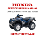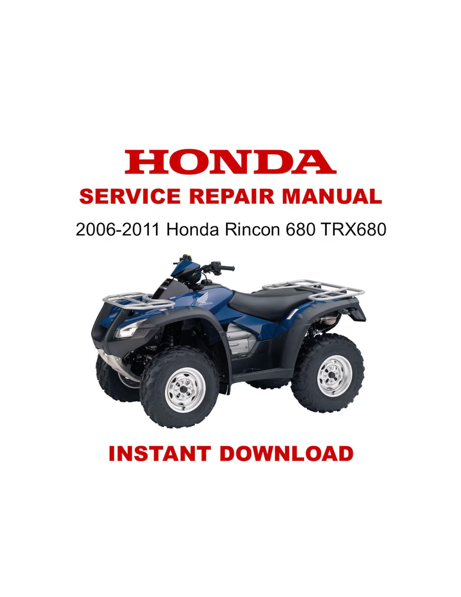 Factory OEM Manual This manual includes model years 2006-2011 for the Honda Rincon 680 TRX680 ATV. This service manual is the most up to date version. This manual would be used by a technician at a shop. THIS IS AN INSTANT DIGITAL DOWNLOAD, NOT A PHYSICAL HARD COPY BOOK Upon purchasing your manual, you will receive an email to download the manual. You can also download your manual on your Purchases Page. IF YOU HAVE ANY TROUBLE DOWNLOADING THE MANUAL THEN PLEASE MESSAGE US. 2006 Honda Rincon 680 2007 Honda Rincon 680 2008 Honda Rincon 680 2009 Honda Rincon 680 2010 Honda Rincon 680 2011 Honda Rincon 680