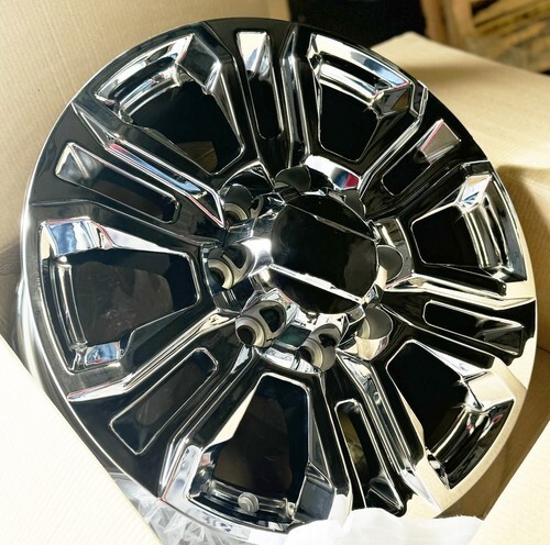 New Set Of Four GM Replica 20" 8 lug (8-180 bolt pattern) Chrome Split Spoke Wheels With Blackhawk Ridgecrawler R/T 33x12.50R20 Tires for 2011-2025 Chevy Silverado 2500 or 3500 and Suburban 2500.