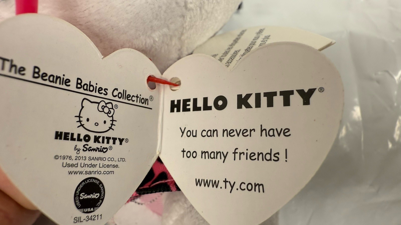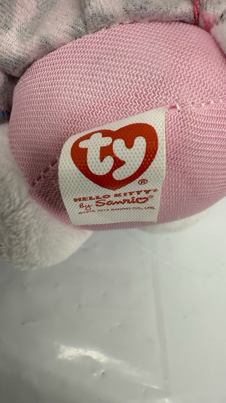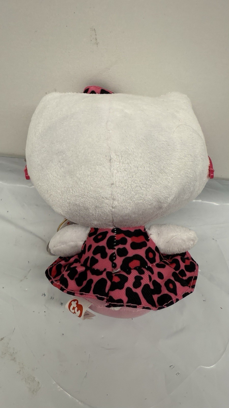 The product is a 7" Hello Kitty plush toy from Sanrio, featuring a pink leopard print dress and bow. Manufactured in 2012, this plush item is part of the Hello Kitty franchise and is made of plush material. Perfect for collectors or fans of the popular animated character, this cute and cuddly toy captures the essence of the lovable Hello Kitty in a fun and stylish way. Ideal for display or play, this adorable plush is sure to bring joy to any Hello Kitty enthusiast.