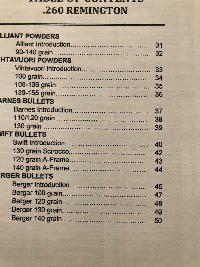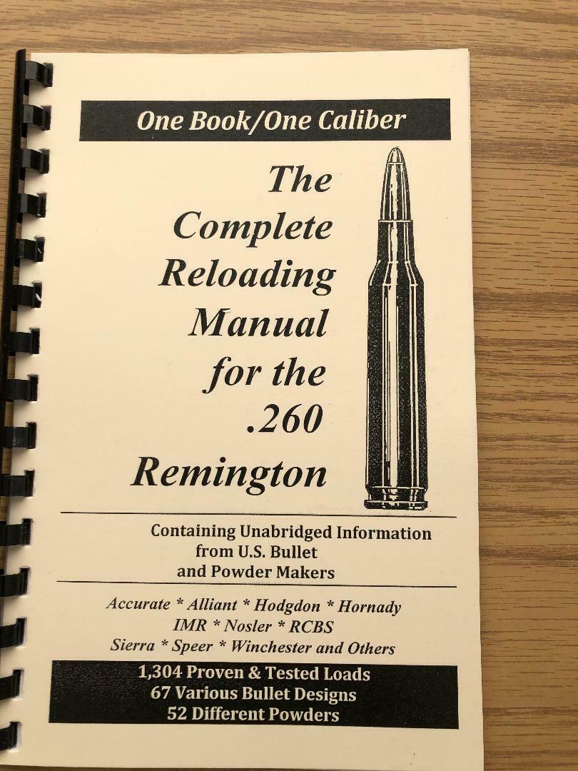 2016 The complete reloading manual for the .260 Remington, 54 pages, New latest edition. This manual contains 1304 Loads, 67 bullet designs, 52 different powders. Data in this manual is comprised from