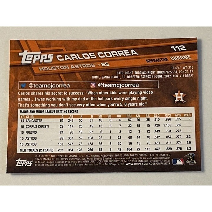 - 2017 Topps Chrome CARLOS CORREA Refractor #112 MLB Minnesota Twins JUST PuULLED*