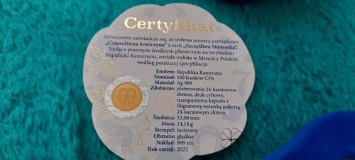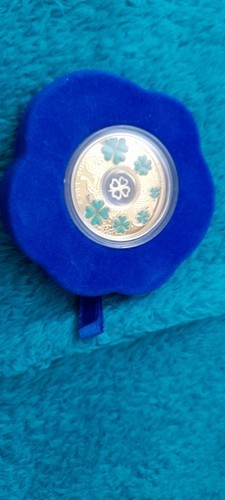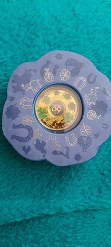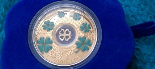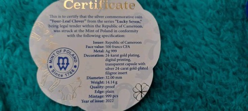2022 REPUBLIC OF CAMEROON 24 ct gold plated .999 silver proof four leaf clover coin from the `lucky seven` series. The 14.14 gm coin is provided in a blue felt case within a case engraved with the seven lucky symbols and is decorated with green 4 leaf clovers and a central floating gold plated silver four leaf clover with GOOD LUCK on the base of the coin. It has a mintage of 900 it`s value is 500 francs and is 32 mm in diameter. Supplied with Mint of Poland certificate in a box.