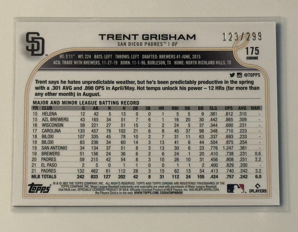 - 2022 Topps Chrome Card #175 Trent Grisham Refractor* - MLB San Diego Padres Mint