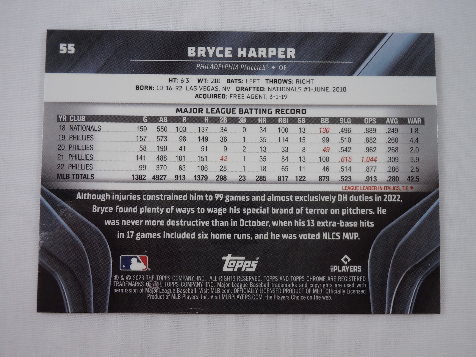 This is a nice example of a 2023 Topps Chrome Black #55 Bryce Harper .Other important information about this card: In 2023 Bryce Harper played for the Philadelphia Phillies.Please check out our other listings for more great cards. Please refer to photos for condition. Any questions please ask.