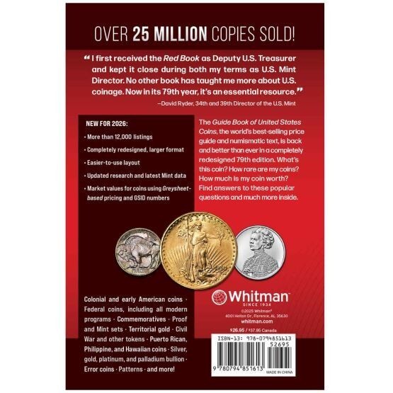 Red Book of United States coin prices The Official Red Book of Coins is a Guidebook of United States coin prices. Collectors and enthusiasts around the country love the book?s photography, mintage data, auction records, grade-by-grade values, detailed specifications, and history. How rare are your coins? How much are U.S. coin values worth? The Red Book of United States coin prices in its 79th edition tells you. Covering everything from early colonial tokens to old silver dollars and gold coins. It?s 79 years old and still going strong. Description: R S Yeoman Pub Date: 4/8/2025 Edition: 79th Binding: Spiral Full color Size: 7.7? x 6? x 1.25? Pages: 472 ISBN: 978-0794851637 2026 Blue Book: Handbook of United States Coins, 83rd Ed. The Handbook of United States Coins?the trusted resource relied upon daily by U.S. coin dealers?returns in its 83rd edition. Wondering if your coins are worth a fortune? The Official Blue Book provides essential pricing information, showing what dealers are paying for U.S. coins from colonials to modern bullion. With easy-to-follow grading guidelines and comprehensive price charts, this authoritative guide offers a practical, real-world view of the U.S. coin market. Description: R S Yeoman Pub Date: 5/6/2025 Edition: 83rd Binding: Hardbound Color: Black White Size: 5 x 7.5 Pages: 312 ISBN: 978-0794851681 A great gift idea for any Coin Collector! FREE shipping applies to the United States On
