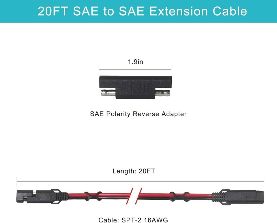 - 20FT Heavy Duty SAE Extension Cable with Dust Covers & Polarity Reversal Adapter