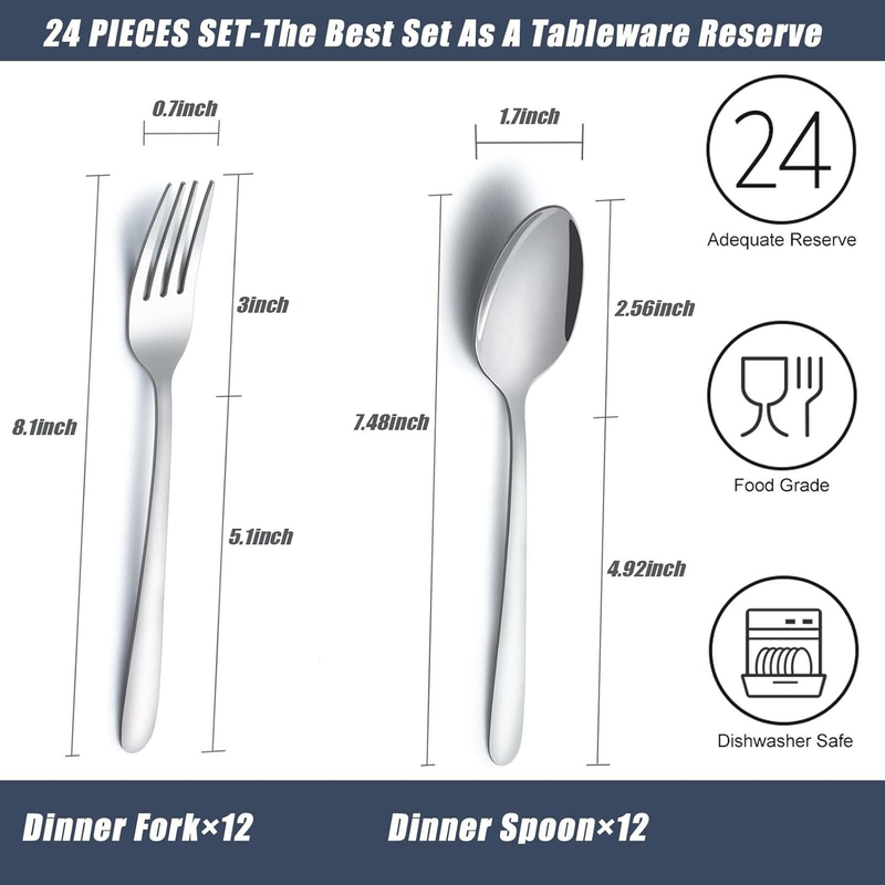 24 Pcs Forks and Spoons Silverware Set, Food Grade Stainless Steel Flatware Cutlery Set for Home, Kitchen and Restaurant, 12 Dinner Forks and Dinner Spoons, Mirror Polished Dishwasher Safe