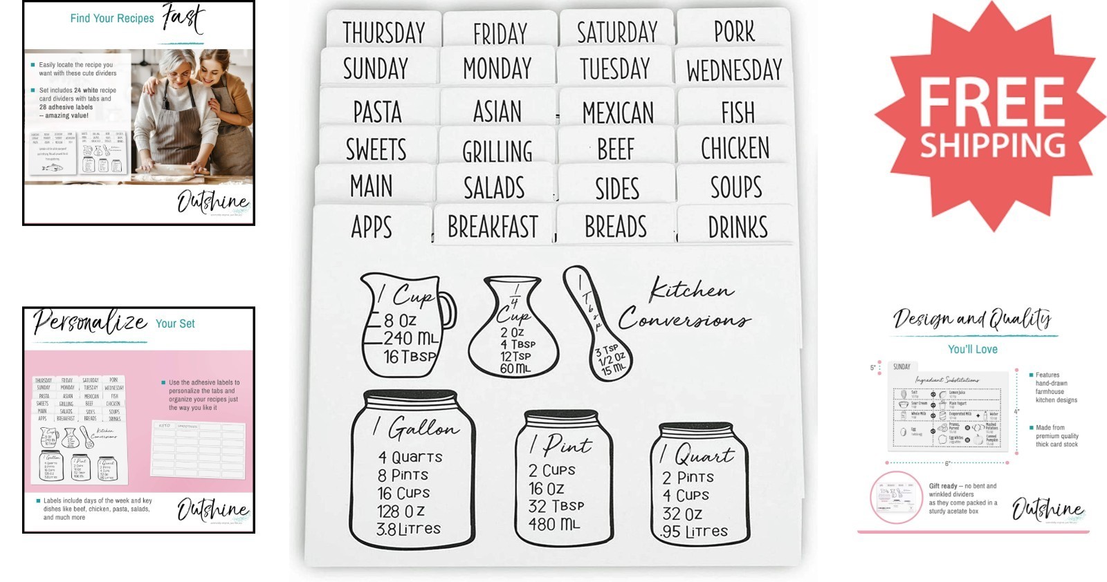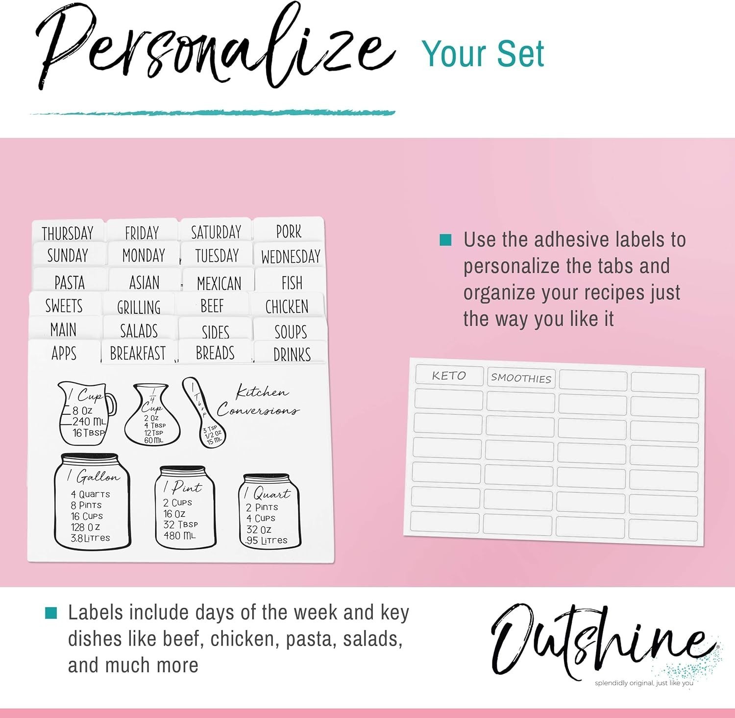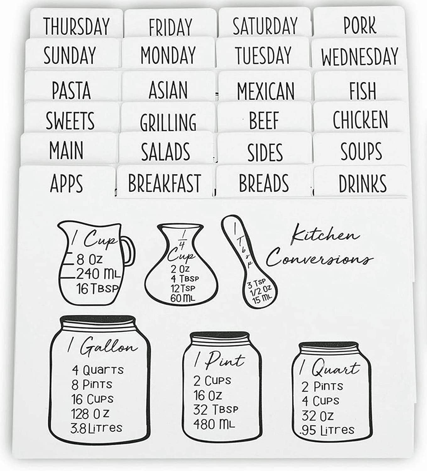 - 24 Recipe Card Dividers with Adhesive Labels & Cooking Tips Included