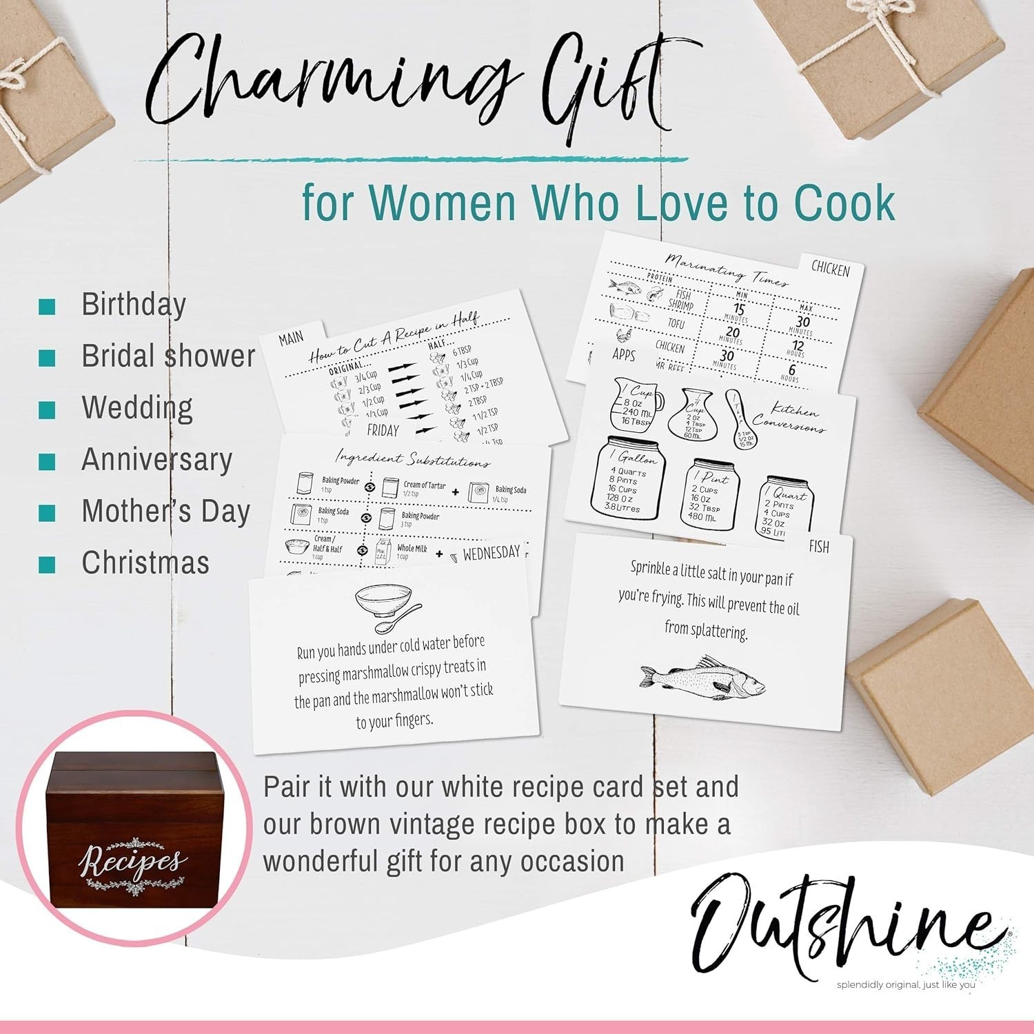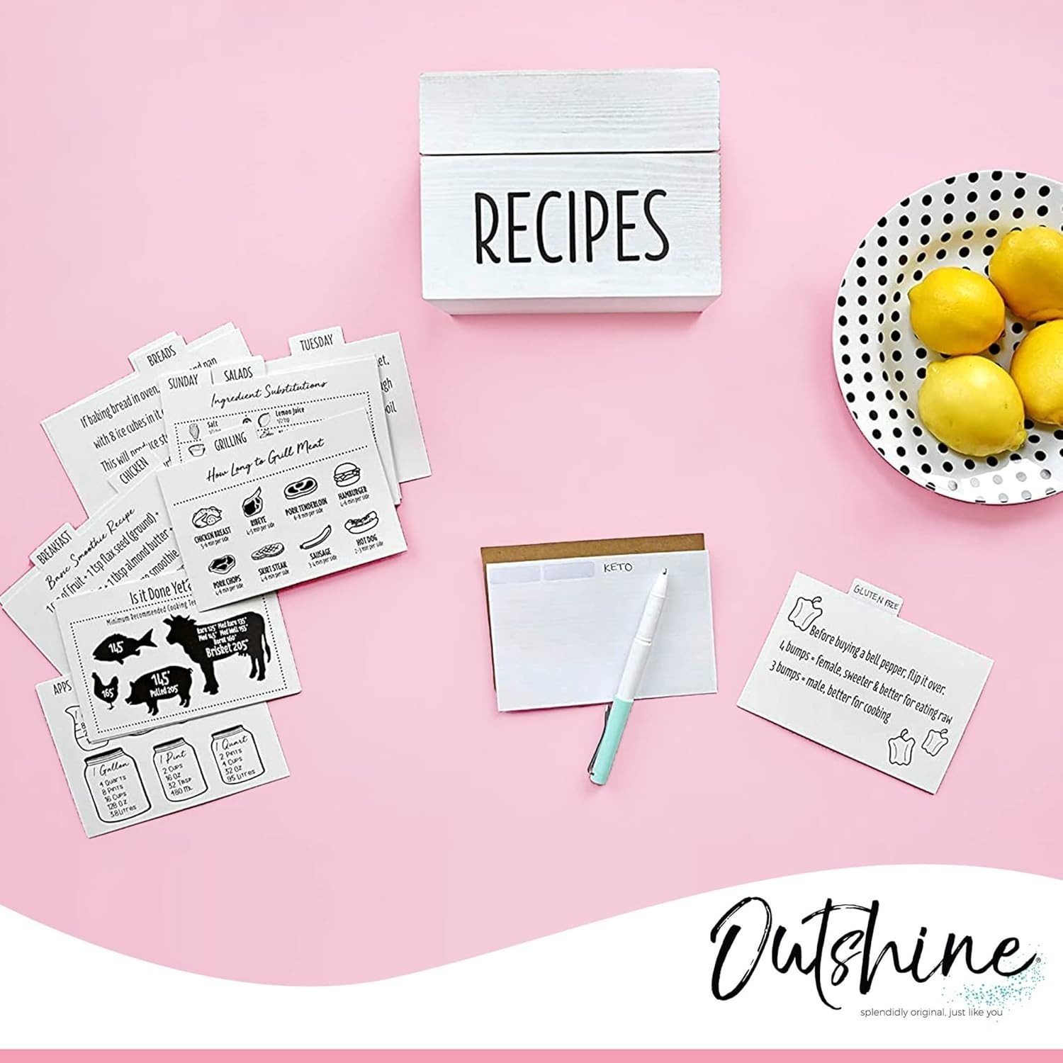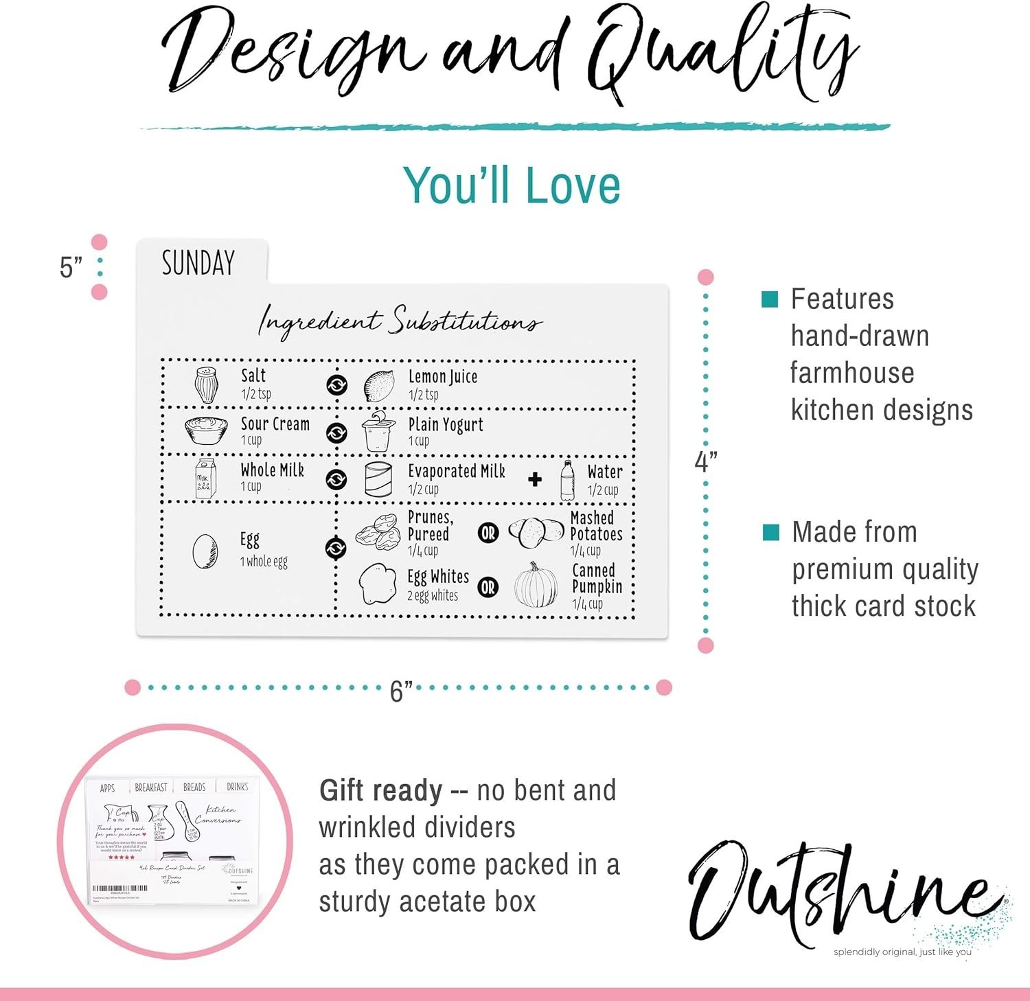 Organize your recipes effortlessly with this comprehensive set of 24 durable 4x6 recipe card dividers, featuring a charming farmhouse kitchen design. Equipped with labeled tabs for all your culinary categories?from days of the week to various meat, pasta, and beverage options?this kit helps you locate recipes in seconds. Personalize your collection using 28 adhesive labels to suit your unique needs. Enhance your kitchen with useful cooking hacks like conversions and substitutions, and create meaningful gifts or keepsakes for loved ones. Perfect for weddings, birthdays, or family heirlooms, this organizer combines style and practicality to elevate your cooking experience.