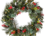 24 in Pre-Lit Wintry Pine Flocked Artificial Christmas Wreath, Christmas Decoration with Pinecones, Red Berries, 50 Clear LED Lights, 113 Tips, Timer, Green