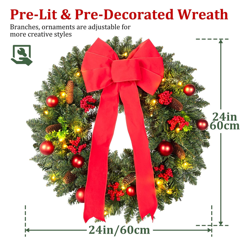Transform your home for the winter holidays with this prelit and pre-decorated Artificial Christmas Wreath Decoration. Designed with Spruce and Pine branches base, this hanging wreath is 24 inches wide and decorated with a red bow, pine cones, golden berries and red berries, ball ornaments. These beautiful decorations complement the wreath's natural-looking branches. It comes with 50 warm LED string lights with 8 modes, place 3 x AA batteries(Not included) into the battery pack to power the lights. IP65 waterproof battery box can withstand most unfavorable weather like rain and snow, suitable for indoors and outdoors.