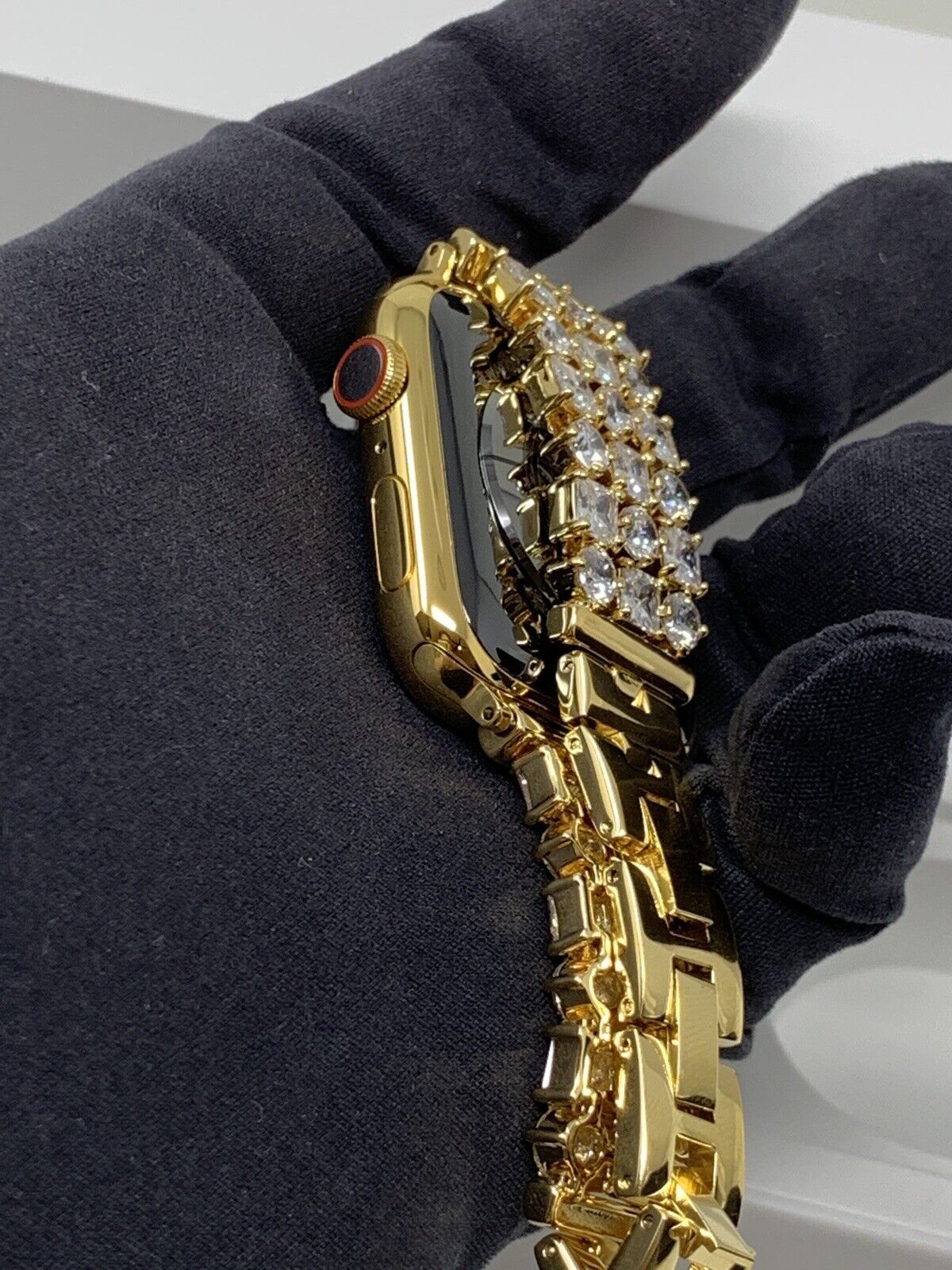 - 24K Gold Plated 45MM Apple Watch SERIES 9 Gold Link Band Diamond Rhinestones LTE