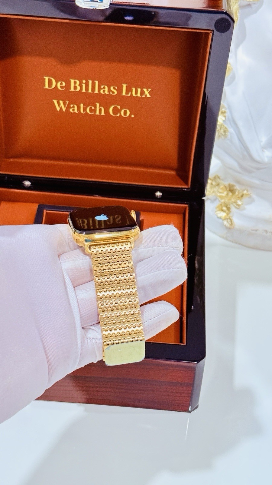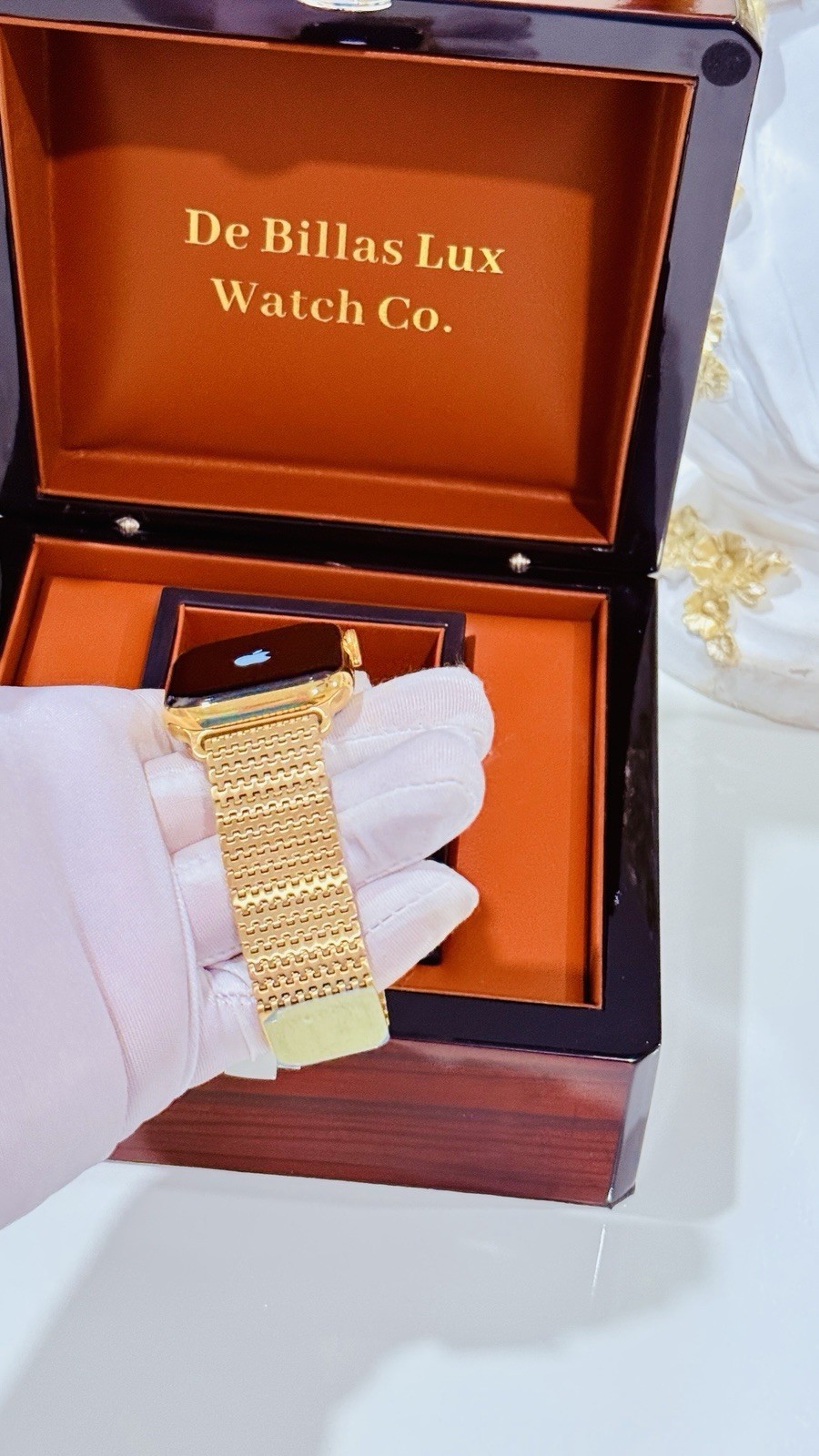 Original Apple Watch Series 9 stainless steel customized and professionally gold plated by De Billas with an industrial grade of authentic 24 Karat Gold.