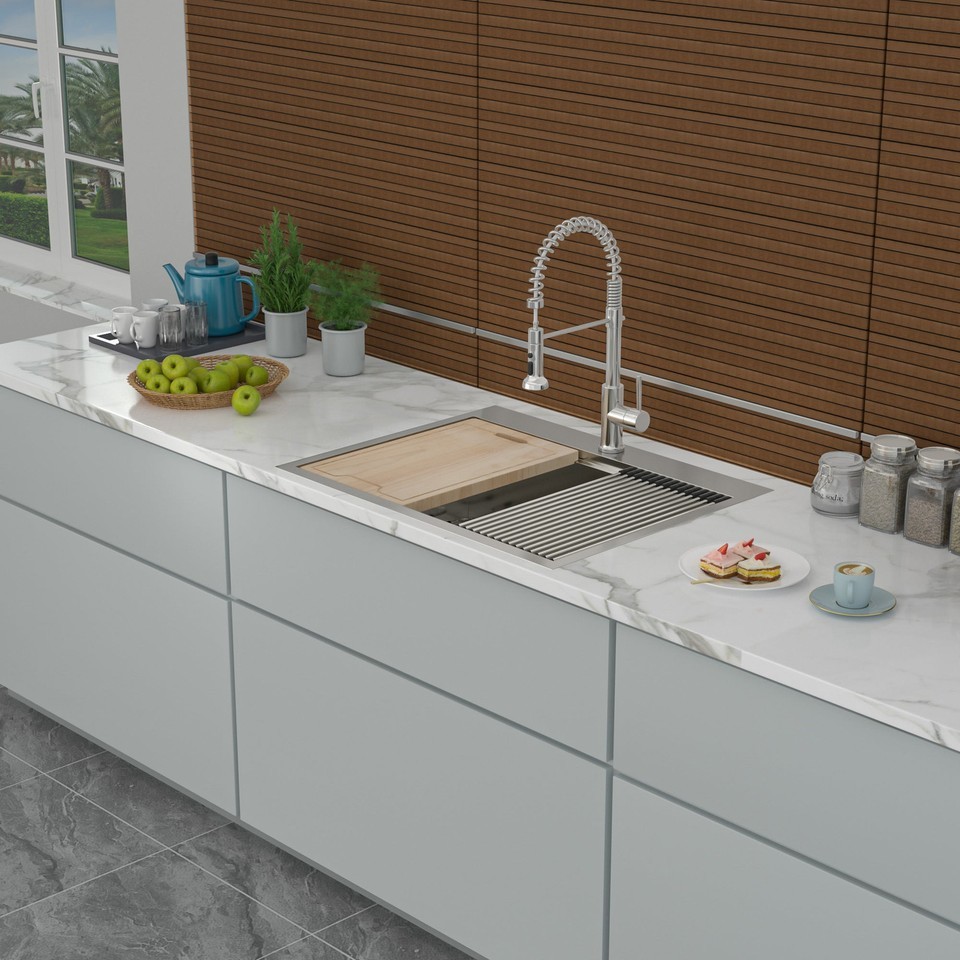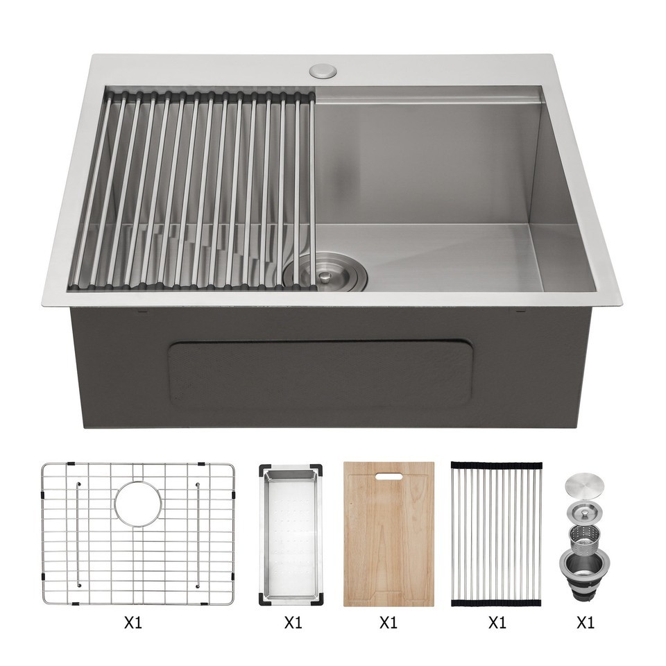25' Drop In Workstation Kitchen Sink, X shape radial and around the water hole is a slope design to allow complete water drainage.