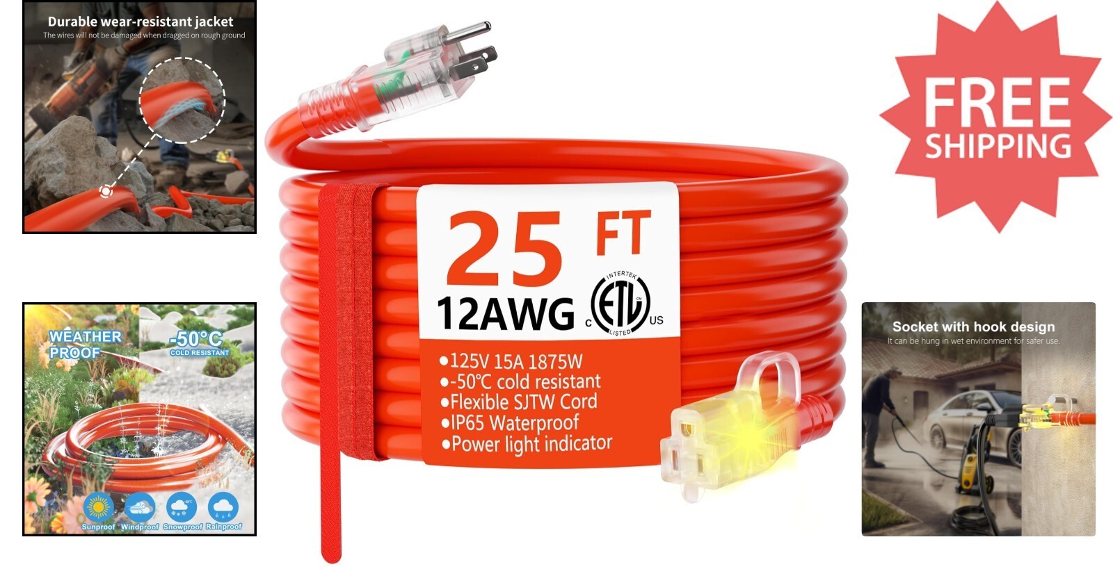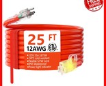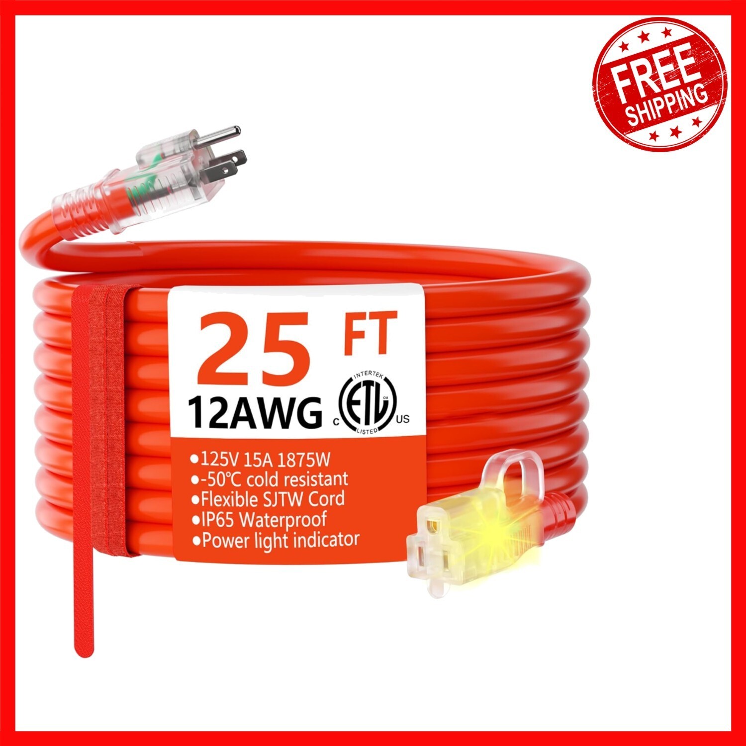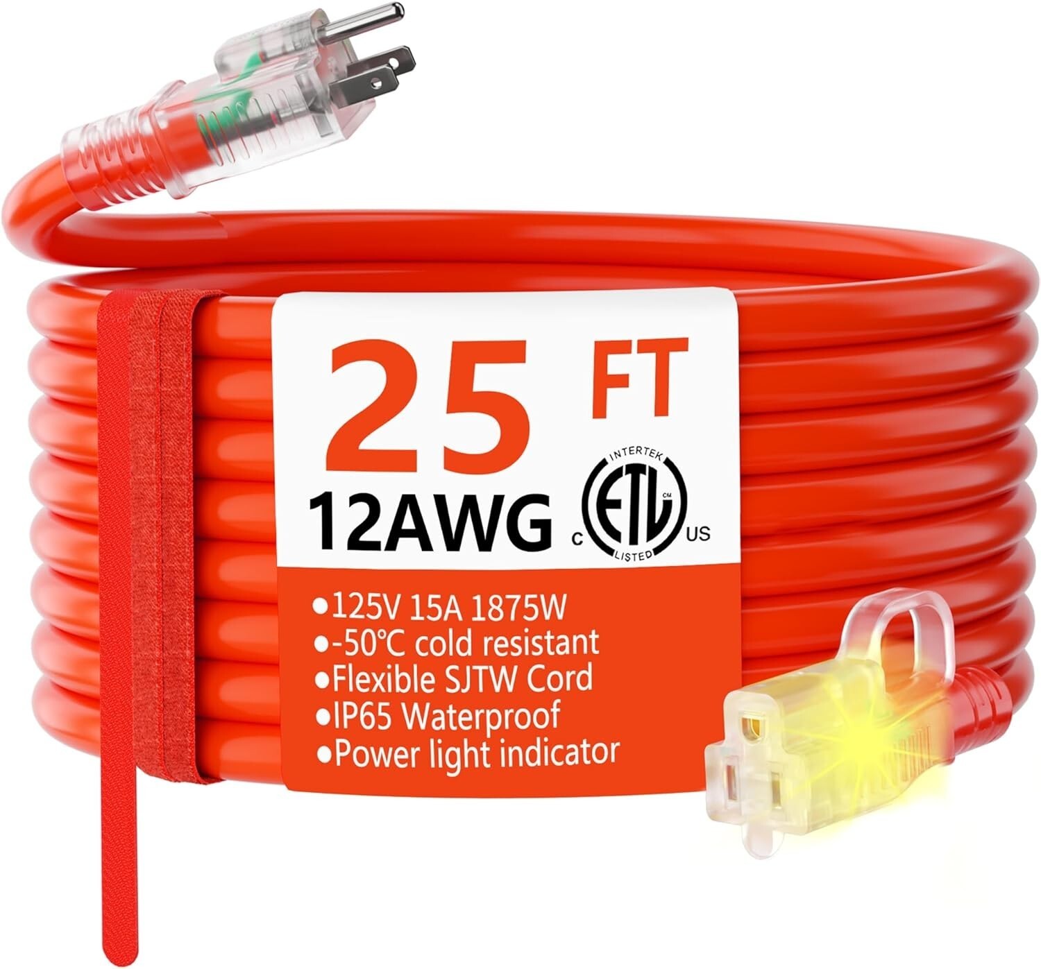 - 25 ft Heavy Duty Outdoor Extension Cord, 12/3 Gauge, Waterproof with Lighted End