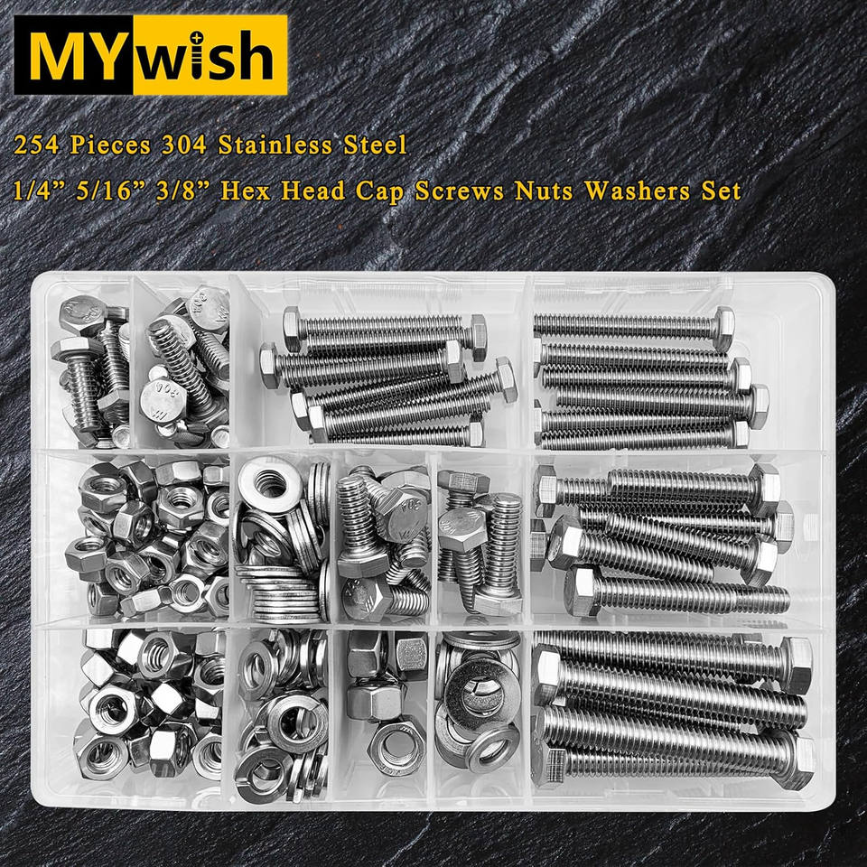 PRODUCT NAME - The 254-Piece Heavy Duty Stainless Steel Bolts and Nuts Assortment Kit is an essential collection for any DIY enthusiast or professional. This comprehensive set includes a variety of bolt sizes such as 1/4-20, 5/16-18, and 3/8-16, along with matching nuts and washers. Each piece features precise threading and is designed for a multitude of applications, ensuring that you have the right fastener for any project. With quantities ranging from 4 to 10 pieces per size, this assortment is ideal for both small repairs and larger assembly tasks.