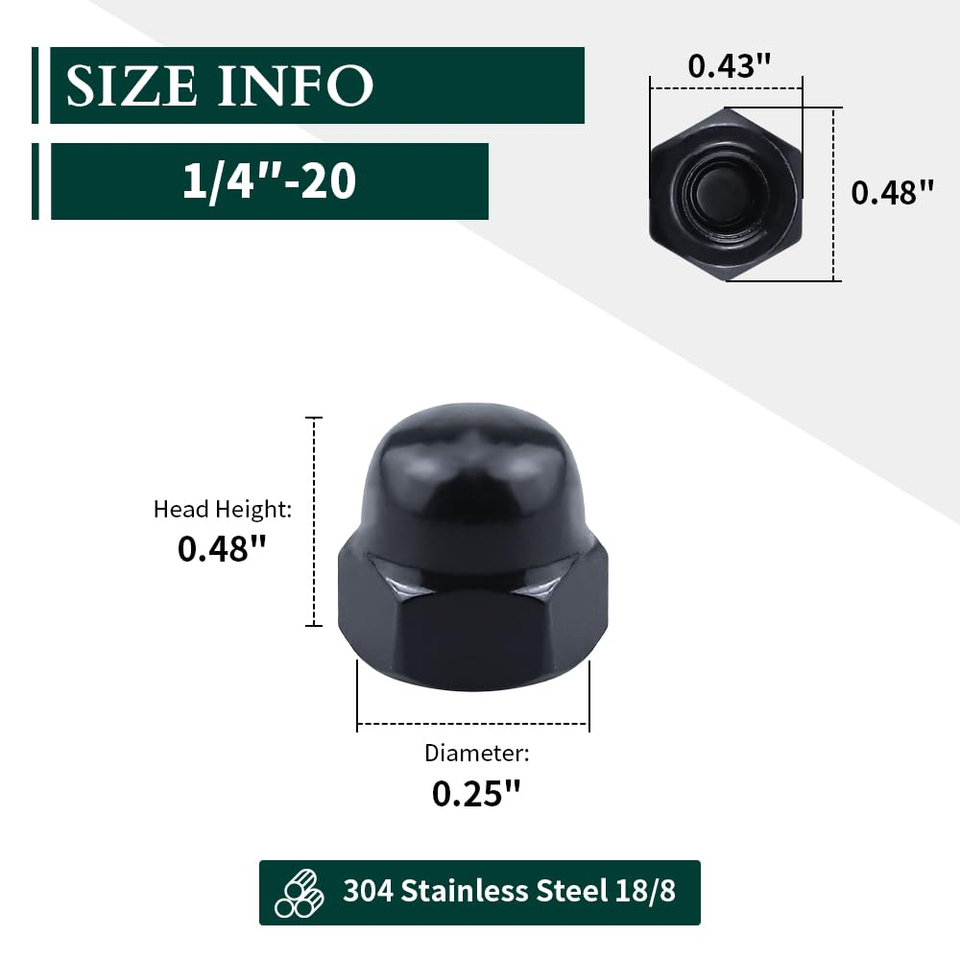 Thread Size: 1/4"-20; Thread Pitch: 20 TPI; Thread Type: Coarse Thread/ UNC Hex Drive Size: 7/16"; Package: 25 PCS Total Height of the cap nut: 0.45 inch (min) Design Feature: Acorn nut are hex nuts with a domed top to cover the end of the bolt tip so to protect the thread and provides a finished appearance. The exposed threads should not be longer than the inside height of the cap nut MATERIAL: Made of 304 Stainless Steel 18/8 with black coating outside which is superior to regular stainless steel and any zinc plated fasteners, provides better strength and corrosion resistance in bad environments like high temperature, cold weather and high humidity areas without the need for time consuming and costly maintenance