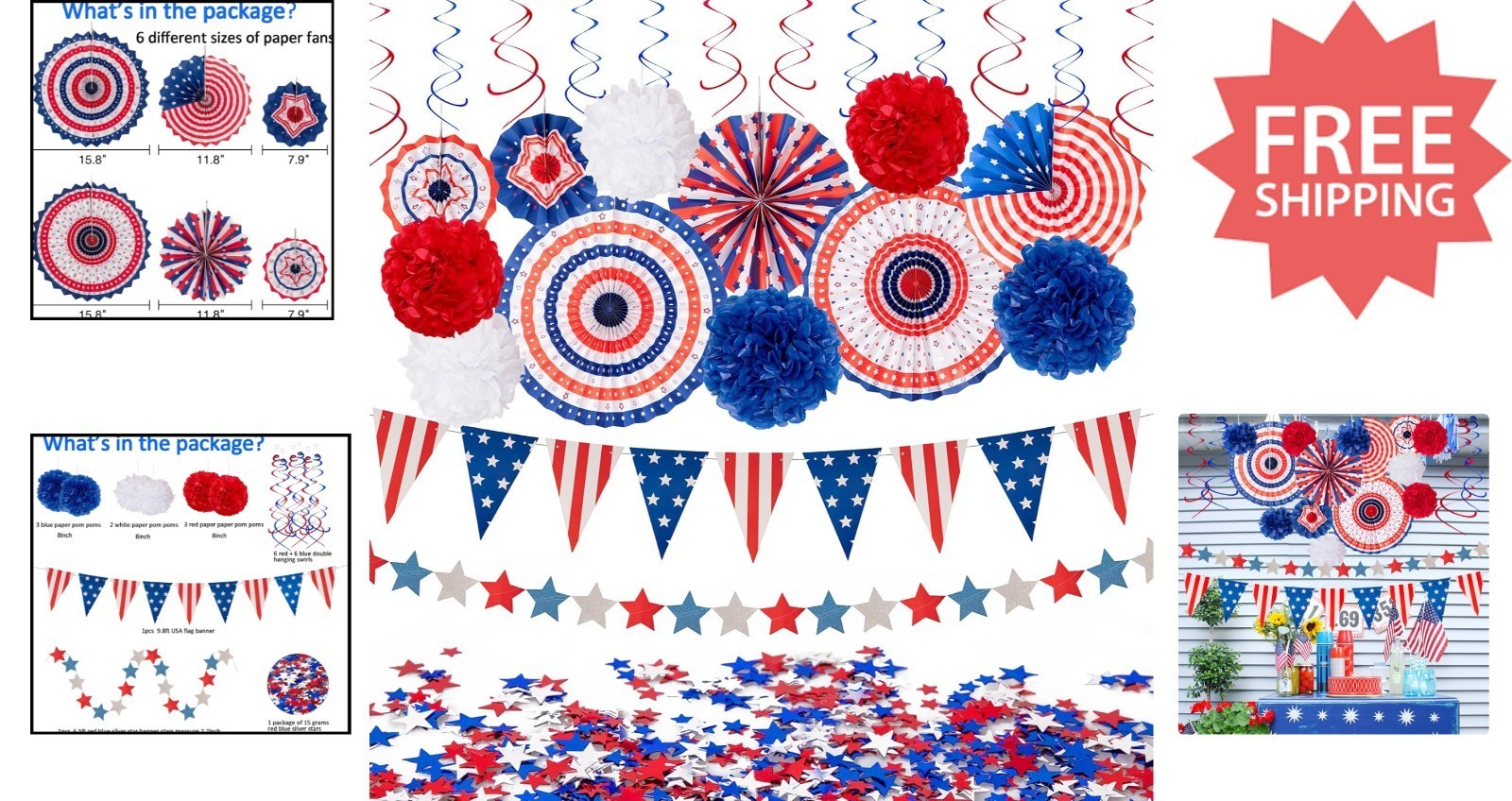 29PCS 4th of July Patriotic Decor Set - Fans, Pom Poms & Banners for Celebration