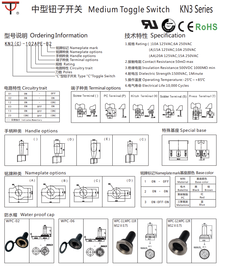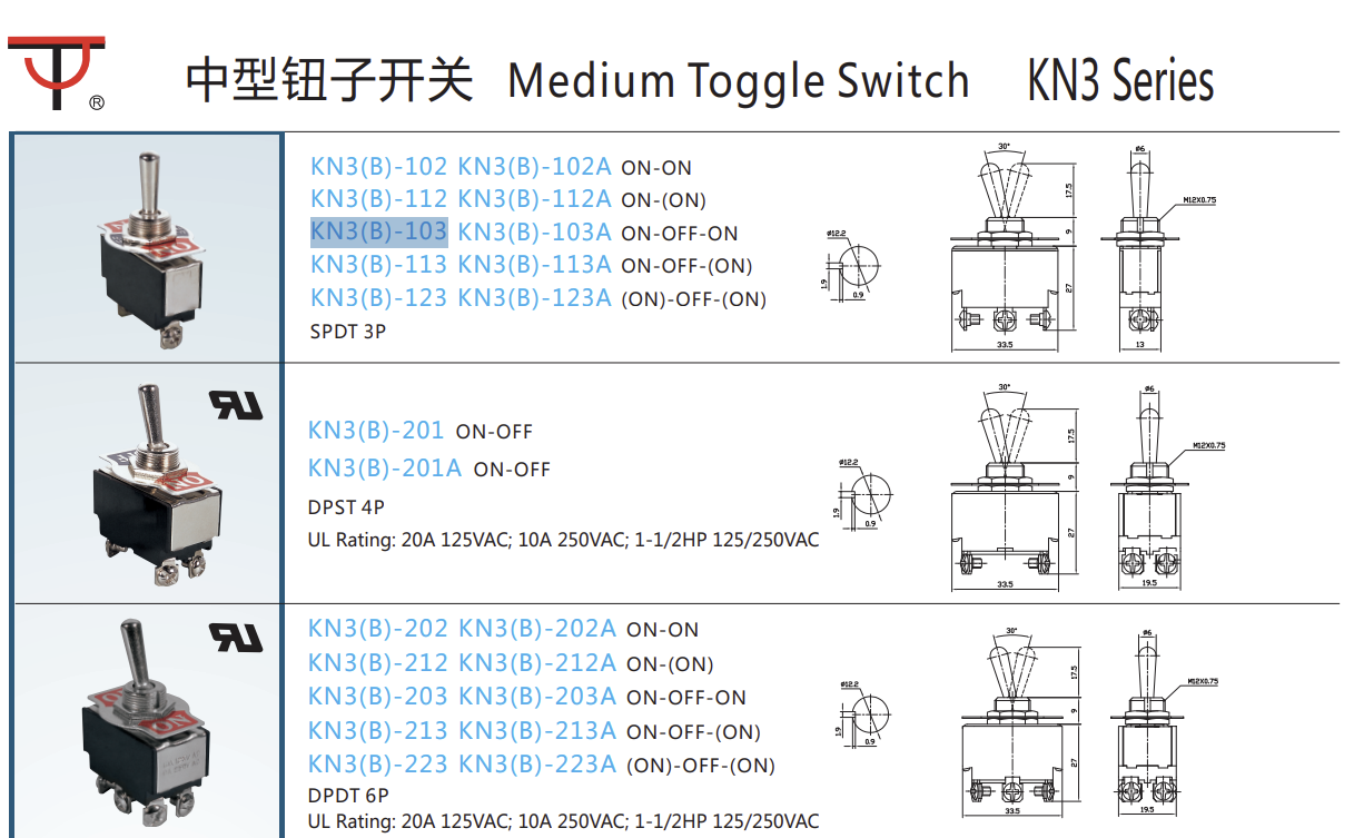 2X KN3B-103 Ningbo Medium Toggle Switch ON-OFF-ON SPDT Maintained 10A 125VAC 6A 250VAC 3 Screw Terminal
