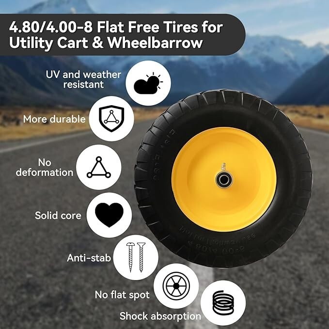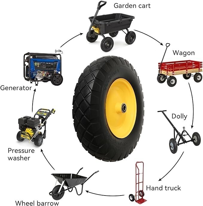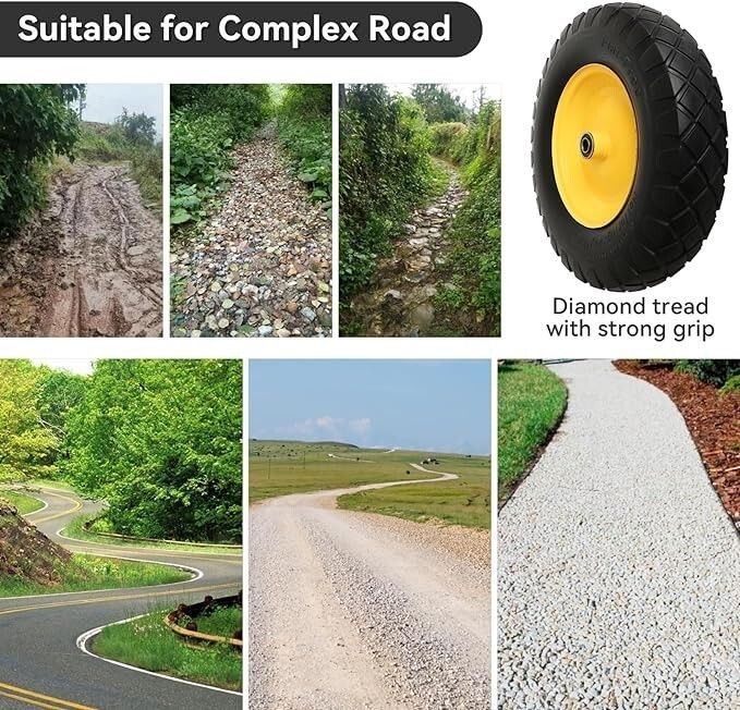 Flat-Free Wheels Our solid wheelbarrow tires provide a maintenance-free and flat-free solution. With their puncture-proof design, you no longer need to worry about inflation or leaks. These durable tires can handle any surface without going flat, ensuring uninterrupted work.
