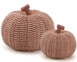 ?TEXTURED WOVEN-STYLE DESIGN: This 2pcs pumpkin figurine set features a rustic woven-style surface that mimics handcrafted basket patterns adding natural texture and depth to your fall decor perfect for cozy farmhouse or boho-inspired interiors IDEAL SIZE FOR SEASONAL DECOR: Comes with two pumpkins approx 6.55.5in and 44in designed for mantels kitchen counters bookshelves or tabletops flat base allows stable placement anywhere throughout your home DURABLE RESIN MATERIAL: Made from high-quality resin with long-lasting structure these pumpkins are built to last through multiple fall seasons adding lasting value to your fall decorations for home or gatherings VERSATILE FOR ANY AUTUMN SPACE: Great for living rooms kitchens offices or farmhouse settings these pumpkins pair perfectly with rustic or modern interiors to enhance your autumn decor with natural seasonal warmth A CHARMING GIFT FOR FALL GATHERINGS: This elegant pumpkin figurine set makes a thoughtful Thanksgiving or housewarming gift for family friends coworkers or teachers ideal for anyone who appreciates tasteful seasonal pumpkin decor