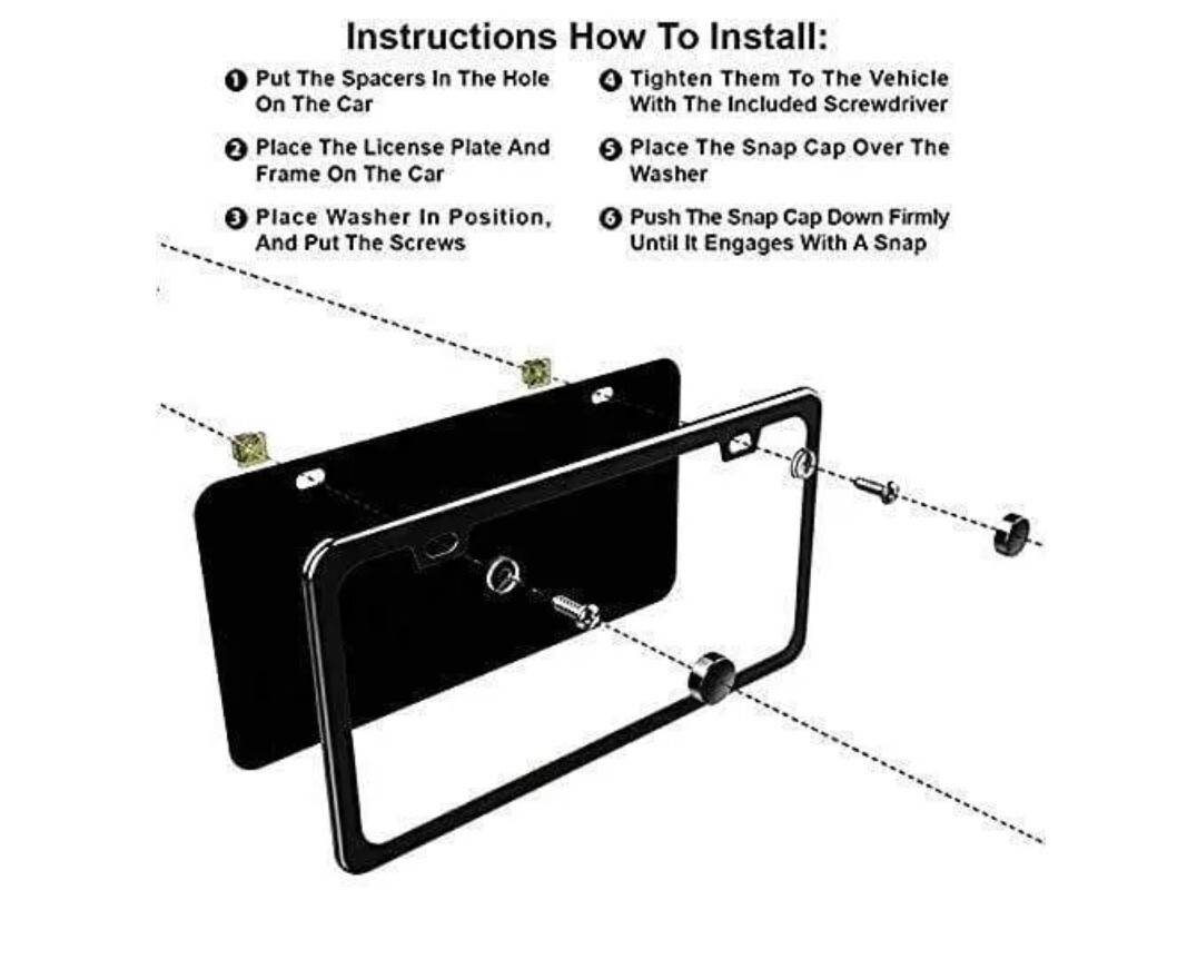 Weight: 9.1 ounces (256 grams). Package Dimensions: 12.6 x 6.5 x 0.7 inches (32 x 16.5 x 1.8 cm). Color: Black. The License Plate Frame can keep your license plate in great condition; various car logo patterns make it more stylish. Made of high-quality stainless steel, it's tough and durable. Designed to universally fit standard US or Canadian 6 x 12-inch license plates. Includes 2 sets for front and back license plates along with all necessary mounting hardware accessories for simple installation. Package Includes: 2 x license plate frames 4 x spacers 8 x screws (including 4 machine screws, 4 self-tapping screws) 8 x screw covers 8 x washers 1 x screwdriver.