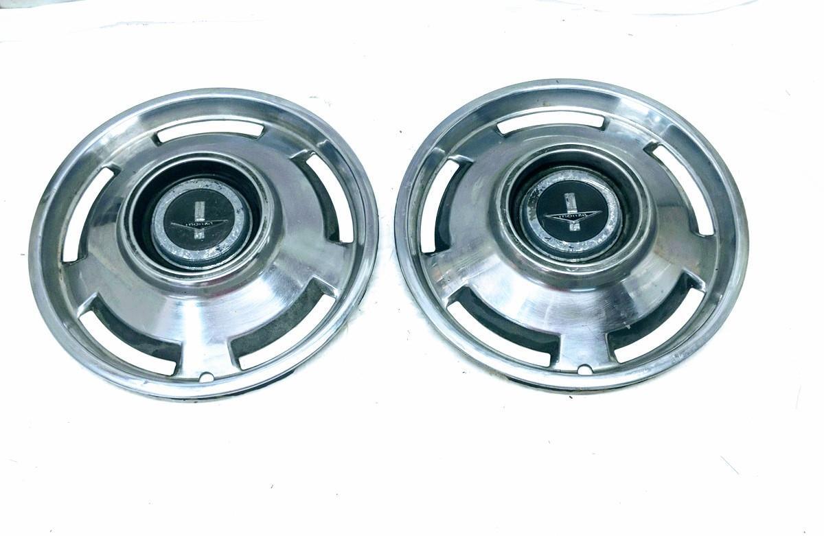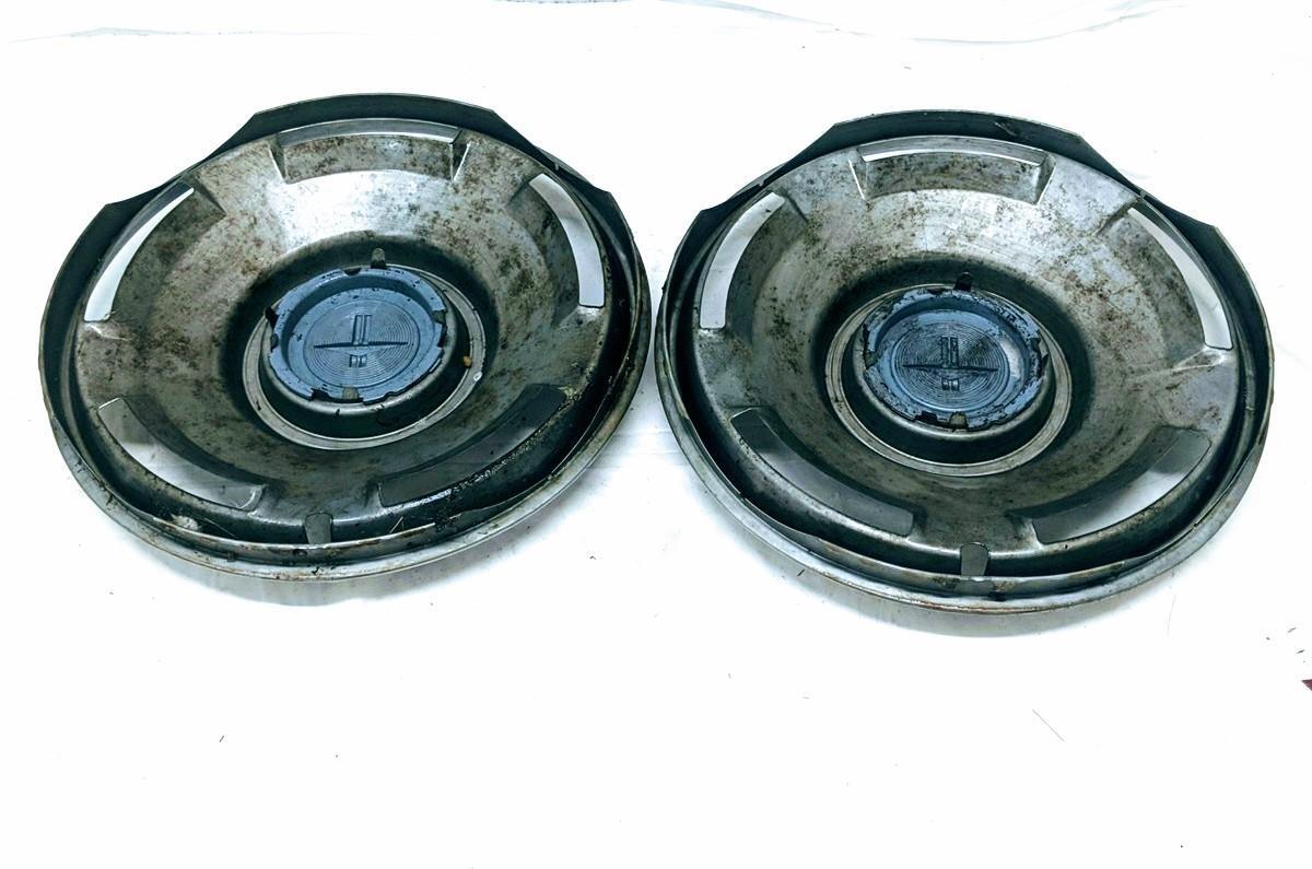 Exact item pair is shown. These are in good used condition. All mounting tabs are intact. Some surface wear, as shown. The center emblems are sun faded from normal use. Please review our business policies in our store for information regarding returns, shipping and warranties.