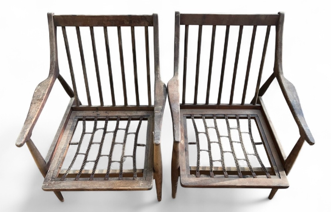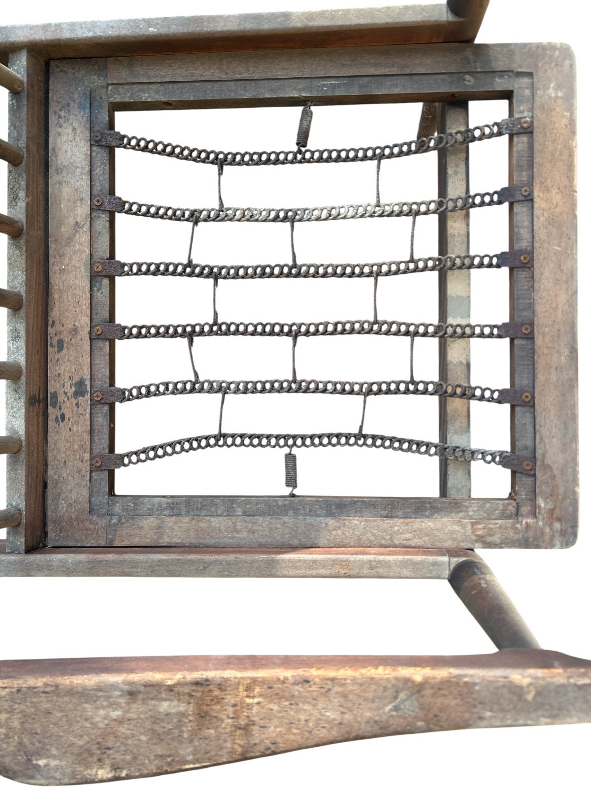 Very structurally sound, spring seat, springs a bit rusted. I'm not expecting 1000 but just put a number up there and looking for a best offer, similar restored chairs can go for a few thousand each but just make me an offer and take these 2 off our hands. They came from my mothers parents shop possibly from the 40s or 50s. Local pickup only in Lincoln NE unless you'd like to pay for shipping. Thank you!